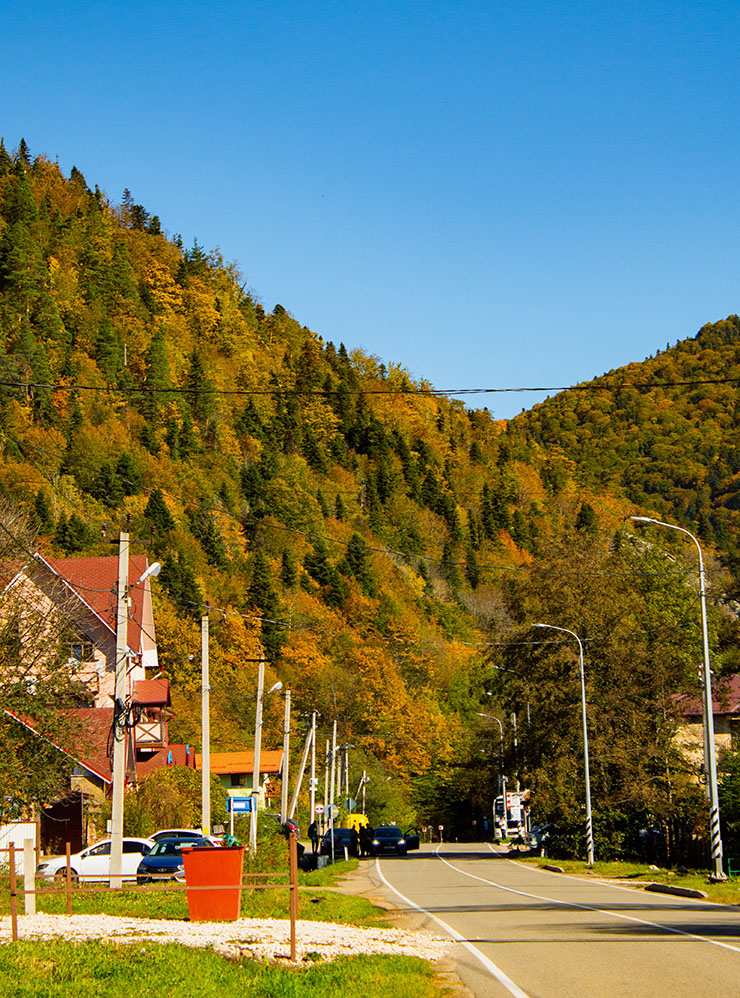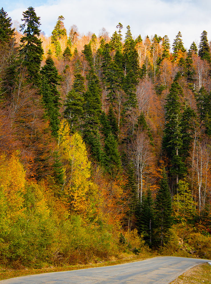 Я больше всего люблю золотую осень в середине октября, когда в лесах деревья, покрытые желтыми листьями, перемешиваются с вечнозелеными соснами. К середине ноября уже становится зябко, особенно в горах, многие маршруты в Кавказском заповеднике закрывают.