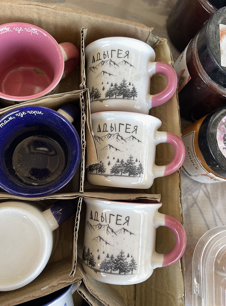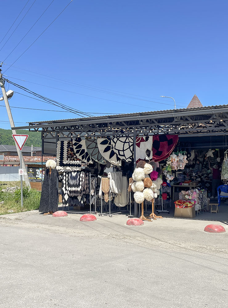 Большое скопление сувенирных лавок в Адыгее я встречала у нижней станции Савранской канатной дороги в Даховской. Там продают типичные сувениры с региональной символикой — магнитики, кружки, деревянные изделия, украшения, открытки, — изделия из шерсти и местные папахи.