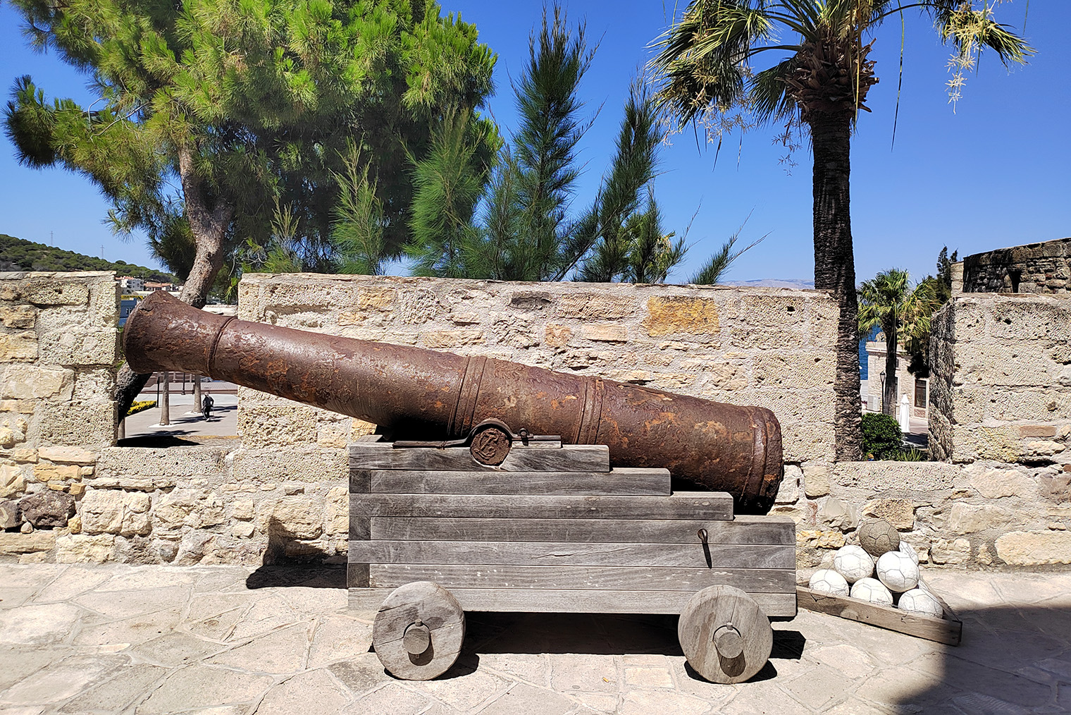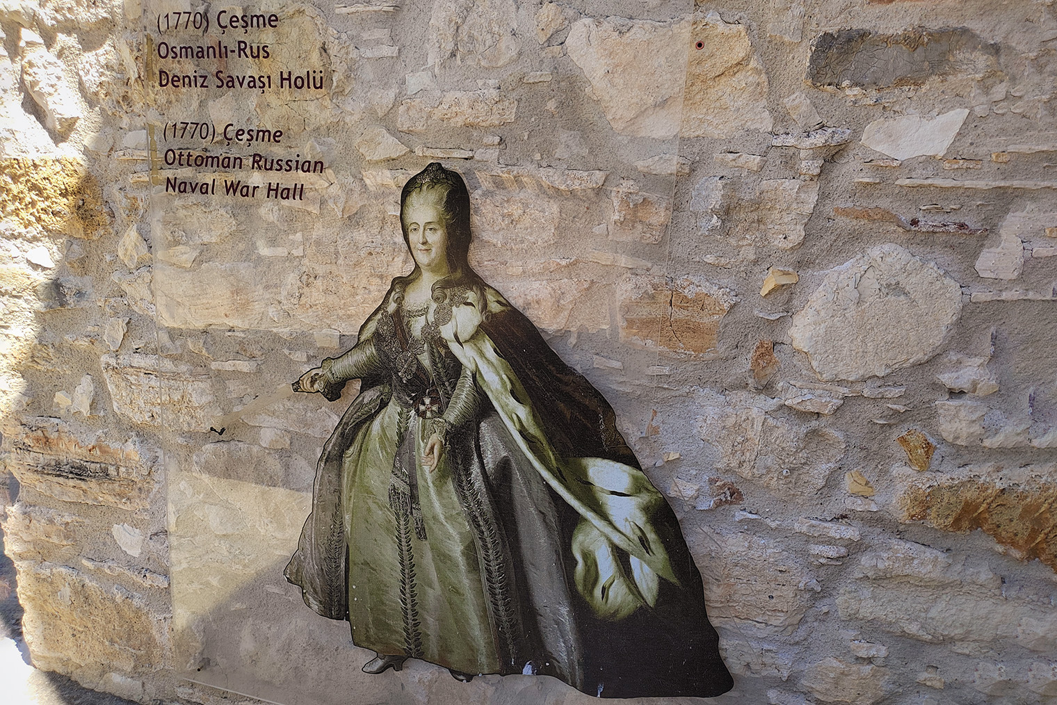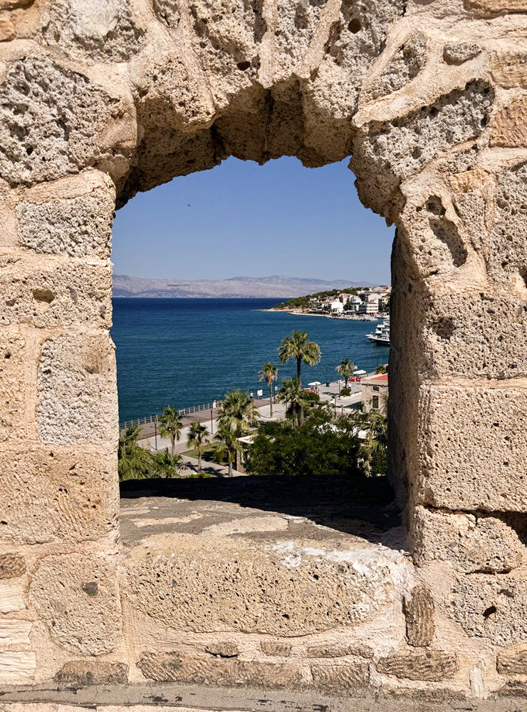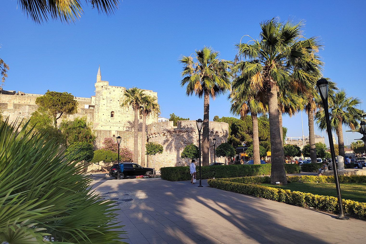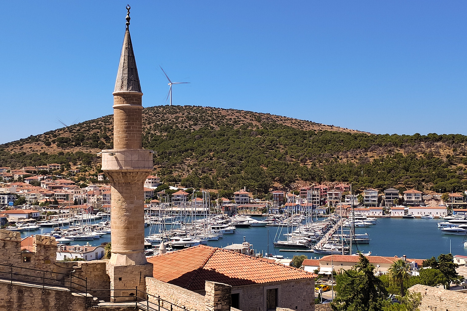 По территории можно гулять и подниматься на стены. С них открываются лучшие виды на Чешме, марину, порт и пролив.