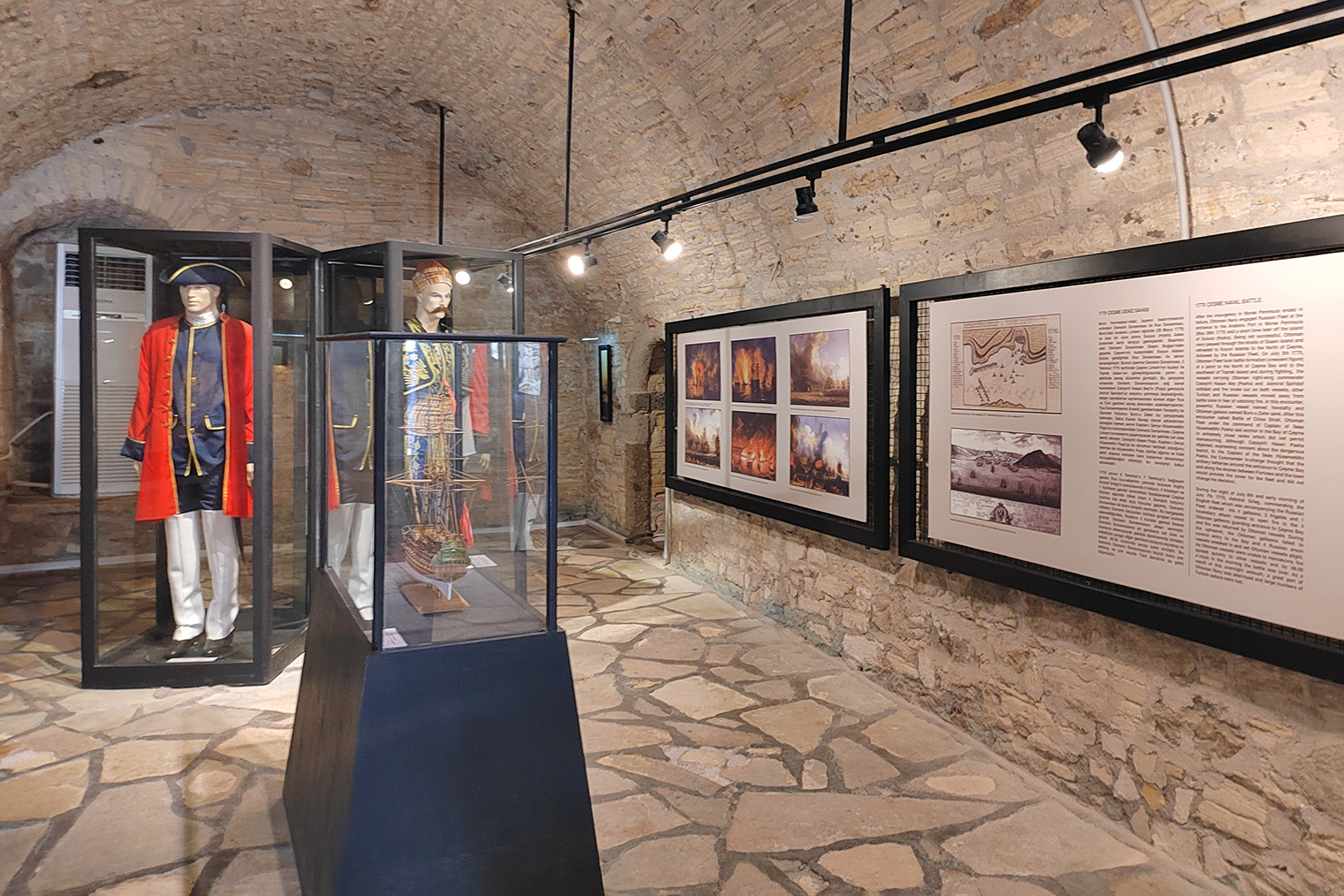 Отдельный зал посвящен Чесменскому сражению 1770 года. В нем смотрят, например, на карты, военную форму, модели кораблей.