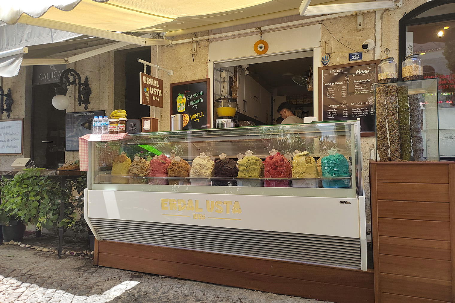 Одна из самых известных турецких сладостей — дондурма, напоминающая мороженое. Ее делают из козьего молока, плодов мастикового дерева, сахара и салепа — напитка из корней орхидей. Классическая дондурма — большая редкость в туристических зонах: в Чешме моя подруга обошла более десяти кондитерских в поисках оригинальной и перепробовала множество шариков мороженого, которое за нее выдавали. И только в заведении Fıstık дондурма оказалась настоящей.