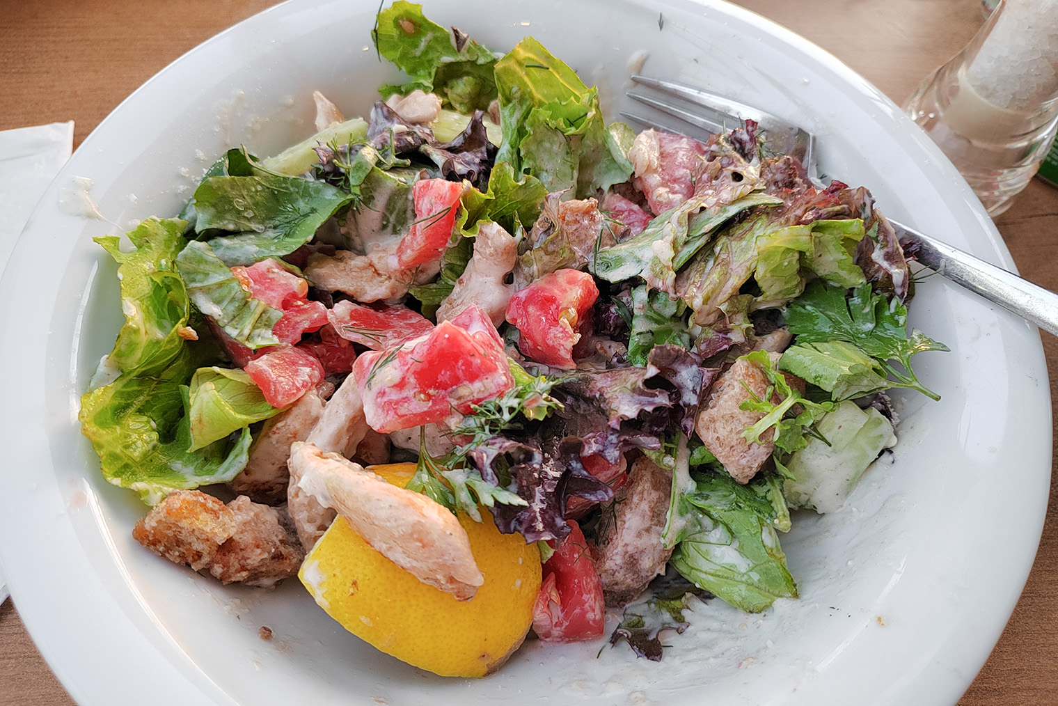 В Cafe De Lucchi очень вкусные салаты. Мы заказали авторскую разновидность цезаря за 380 TRY (693 ₽) — по одной порции на двоих, так как в турецких кафе они огромные. Салат оказался настолько вкусным, что через пару дней мы вернулись в заведение и взяли по порции на каждого.