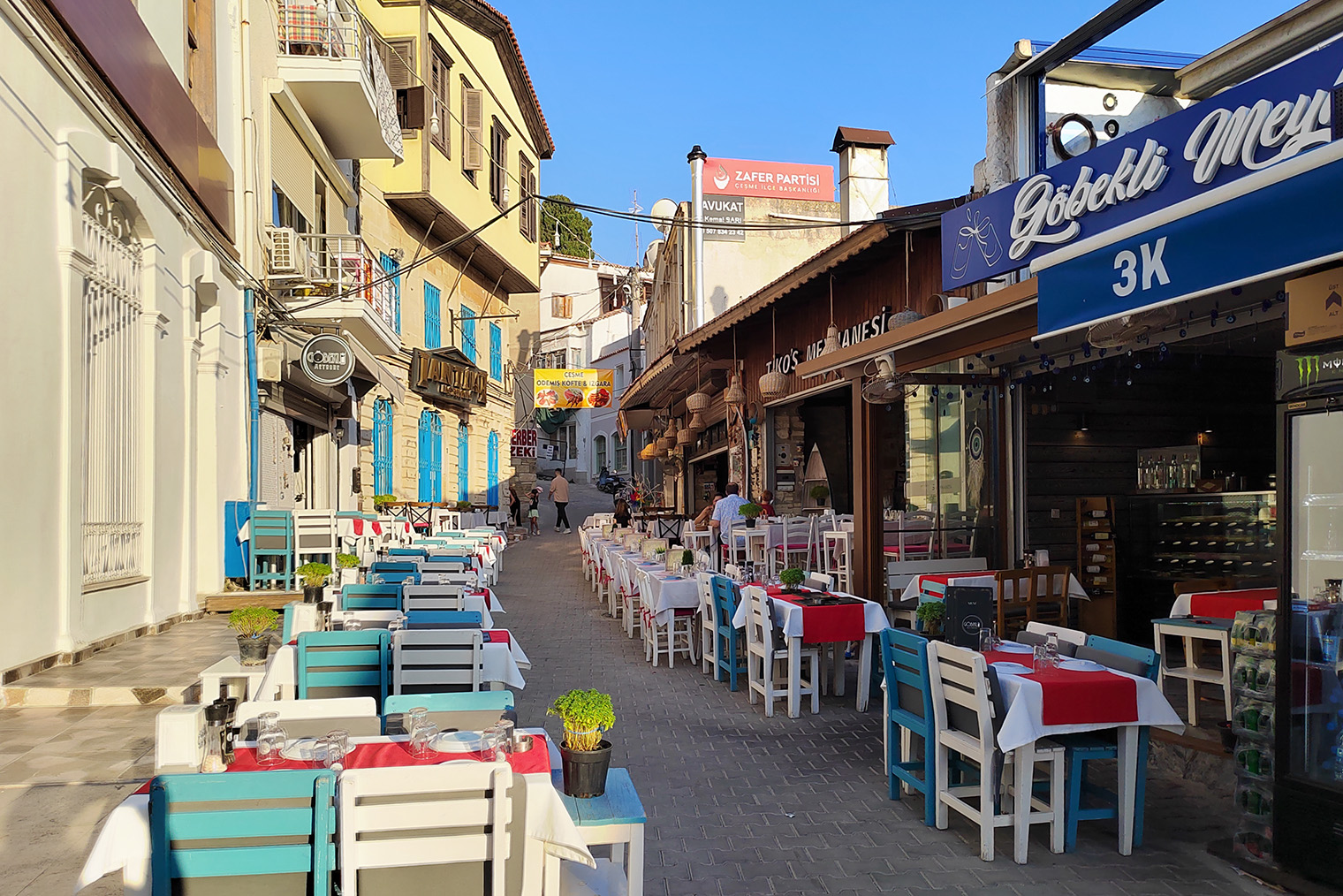 Улица Kemalpaşa Cd. — туристический центр Алачати со множеством кафе, ресторанов и магазинов. Там оживленно и шумно. Автомобили ездят редко, так что это в основном пешеходная зона. От Kemalpaşa Cd. в разные стороны расходятся миниатюрные улочки, где легко затеряться.