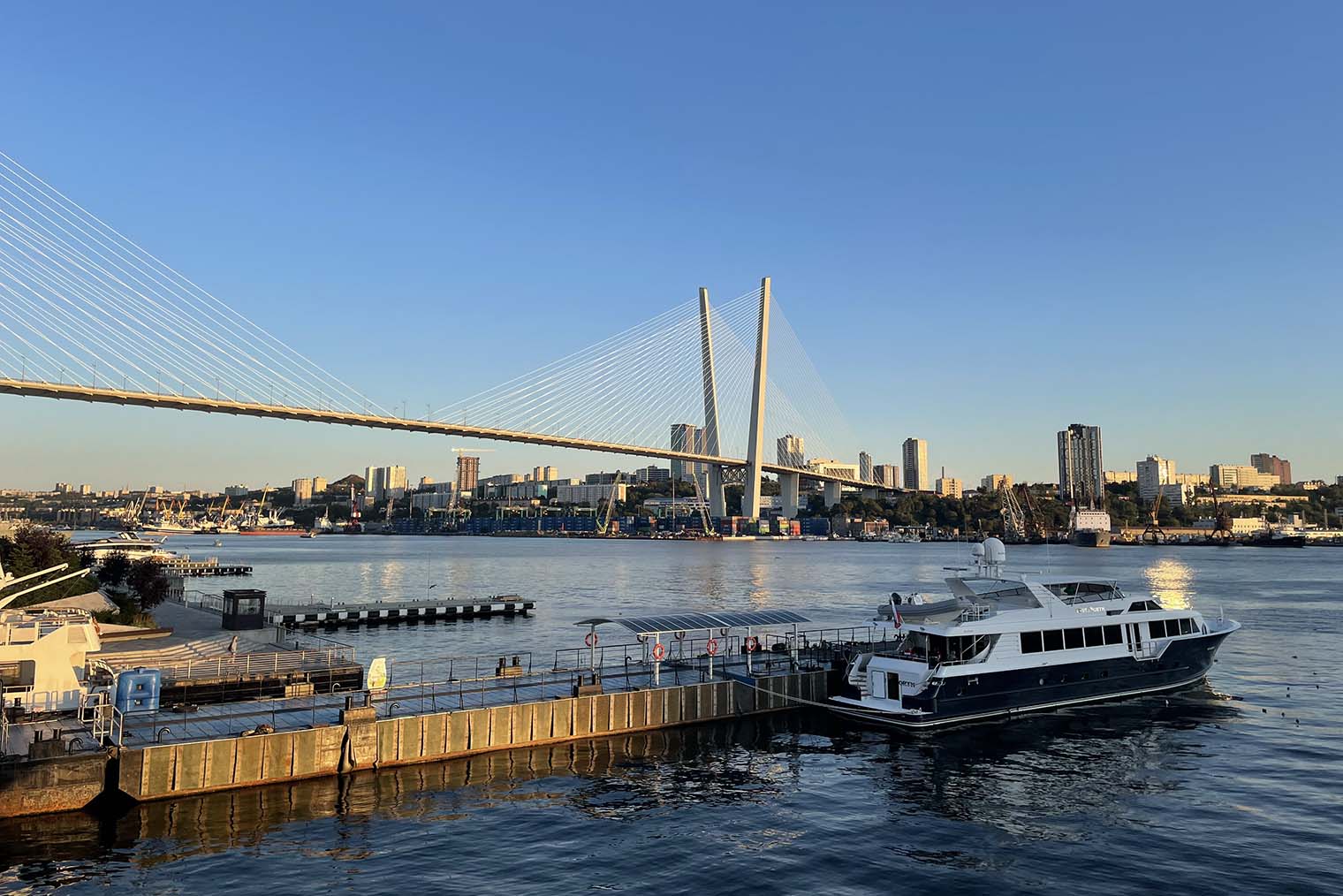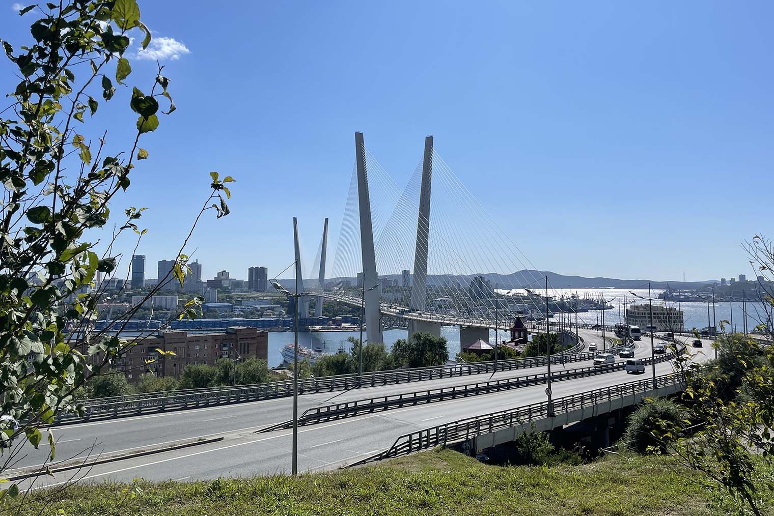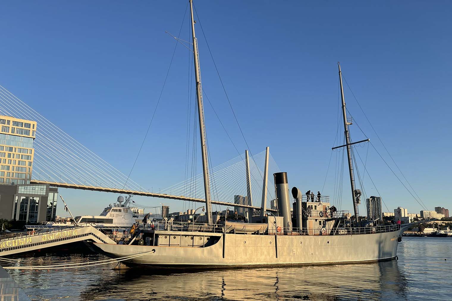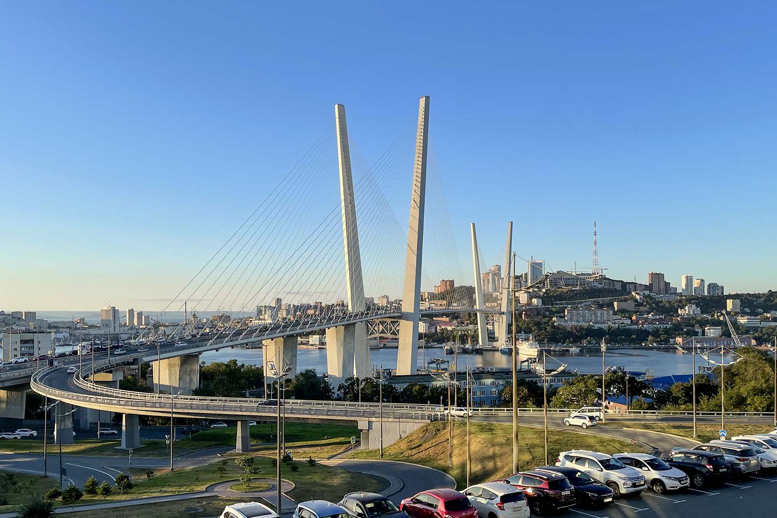 Золотой мост. Вантовый мост через бухту Золотой Рог — одна из главных достопримечательностей города. Опоры в виде буквы V впечатляют своими размерами. Мост изображают на многих сувенирах как символ Владивостока, туристы делают с ним фото на память и смотрят на него с обзорных площадок — о них будут подробности дальше. Из-за Золотого и Русского мостов и моря в центре города Владивосток иногда называют российским Сан-Франциско.