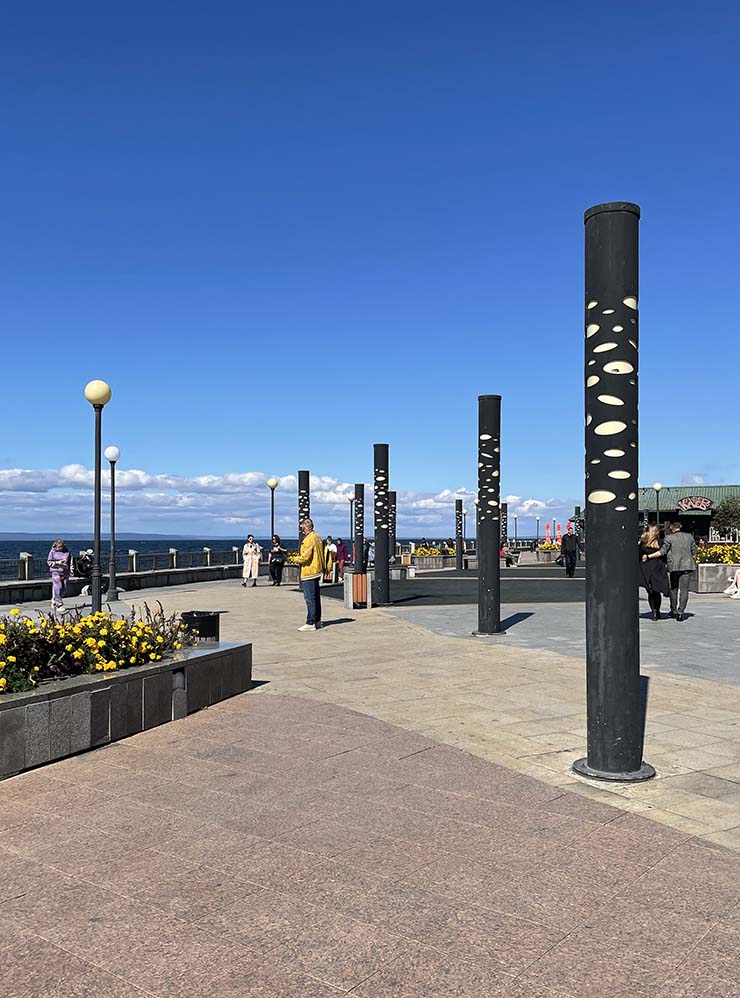 Набережные. Я обожаю гулять пешком по Океанскому проспекту в сторону Корабельной набережной. Она находится в самом центре города и считается местом основания Владивостока. С набережной рассматривают пассажирские и военные суда. Еще там стоят корабли-музеи, в которые пускают посетителей: «Красный вымпел», один из первых боевых кораблей дальневосточных морских сил, и подводная лодка С-56.