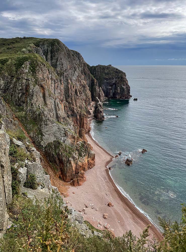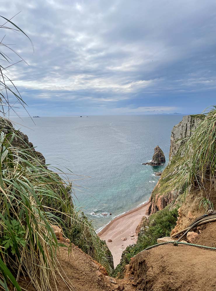 Туда идут ради видов с тропы вдоль берега: с нее открывается панорама моря, других островов, а далеко внизу — пляжи с красным песком.
