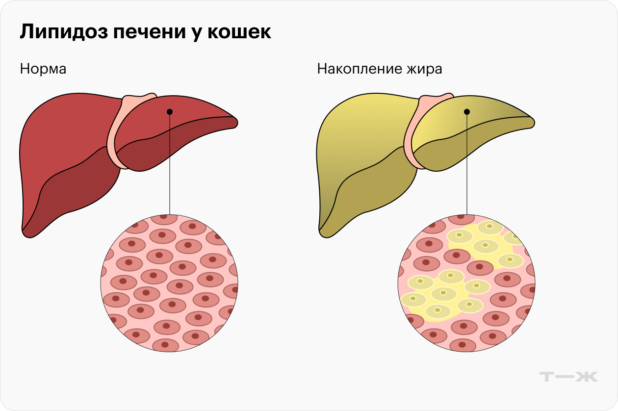 Даже если кошка провела без еды сутки, у нее увеличивается риск развития липидоза печени — потенциально смертельного состояния, при котором в клетках печени копятся жирные кислоты и продукты их обмена.