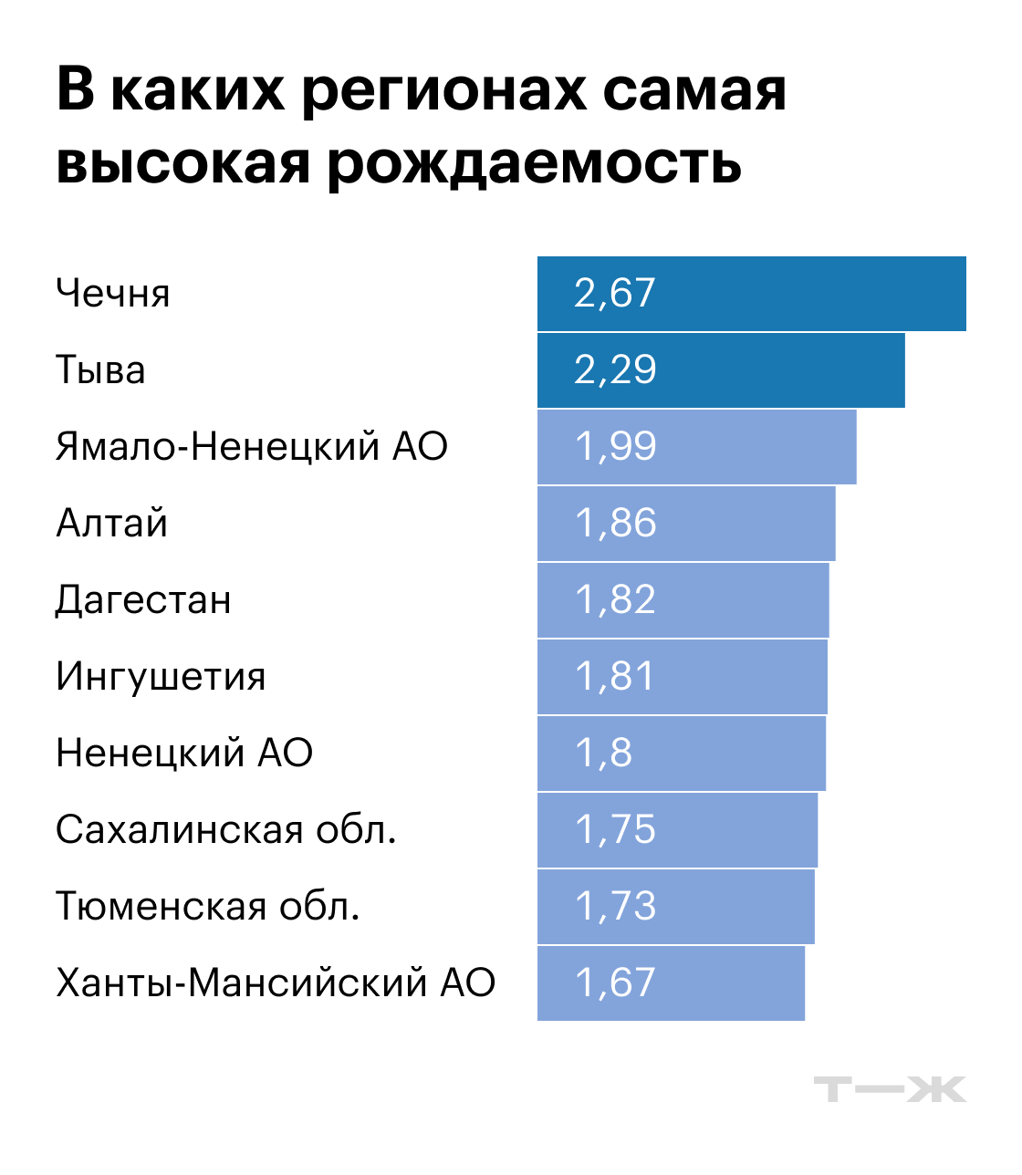 Только два региона страны превышают порог воспроизводства по суммарному коэффициенту рождаемости. В Чечне на одну женщину приходится в среднем 2,67 рожденных ребенка, в Тыве — 2,29. В ЯНАО показатель близок к норме, но немного недотягивает — 1,99.