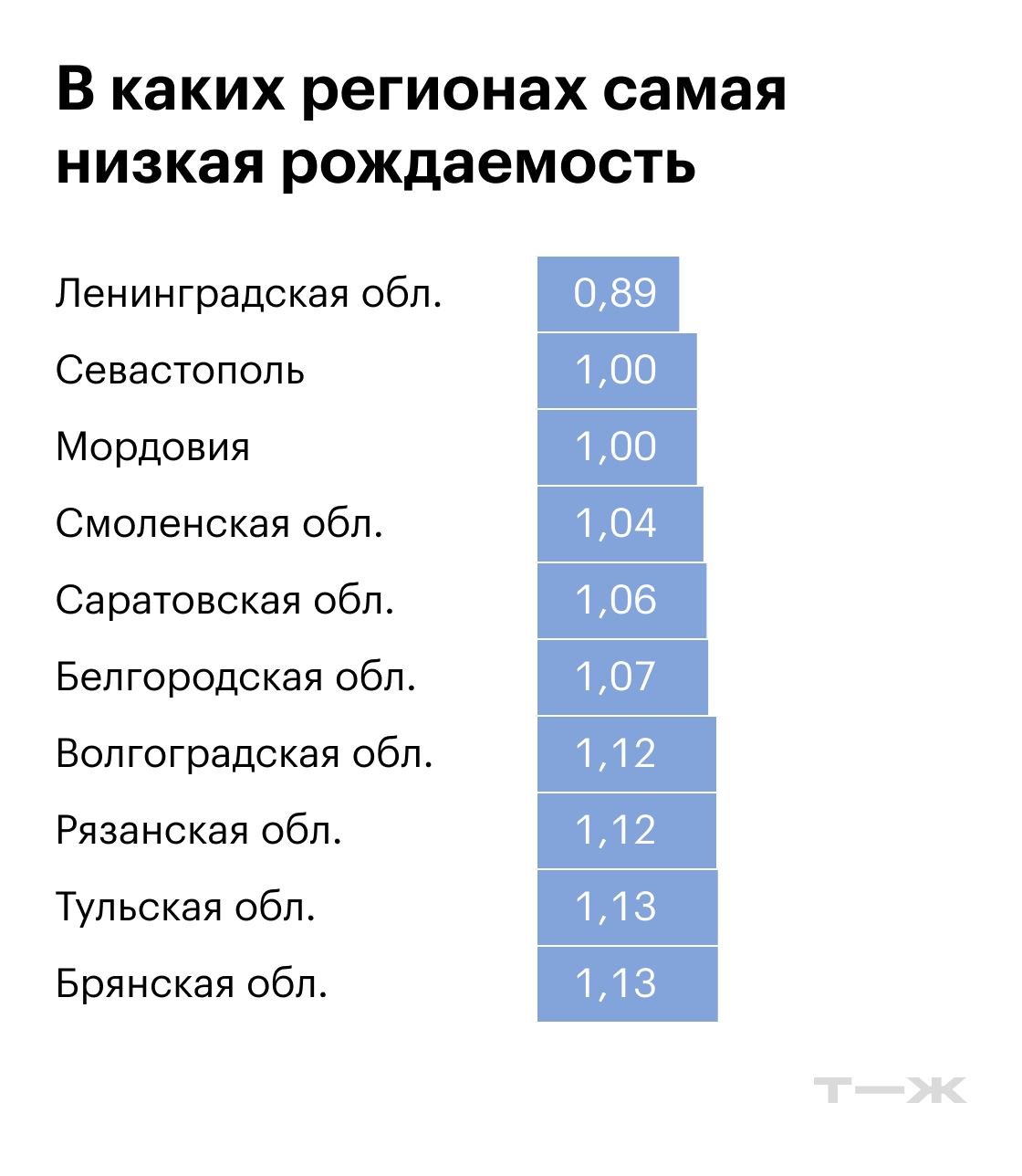 Меньше всего СКР в Ленинградской области, Севастополе и Мордовии — ниже единицы. К другим территориям с самой низкой рождаемостью относятся, как правило, регионы Центральной России, Черноземья и Поволжья: например, Саратов и Волгоград, Белгород и Брянск, Тула и Рязань.