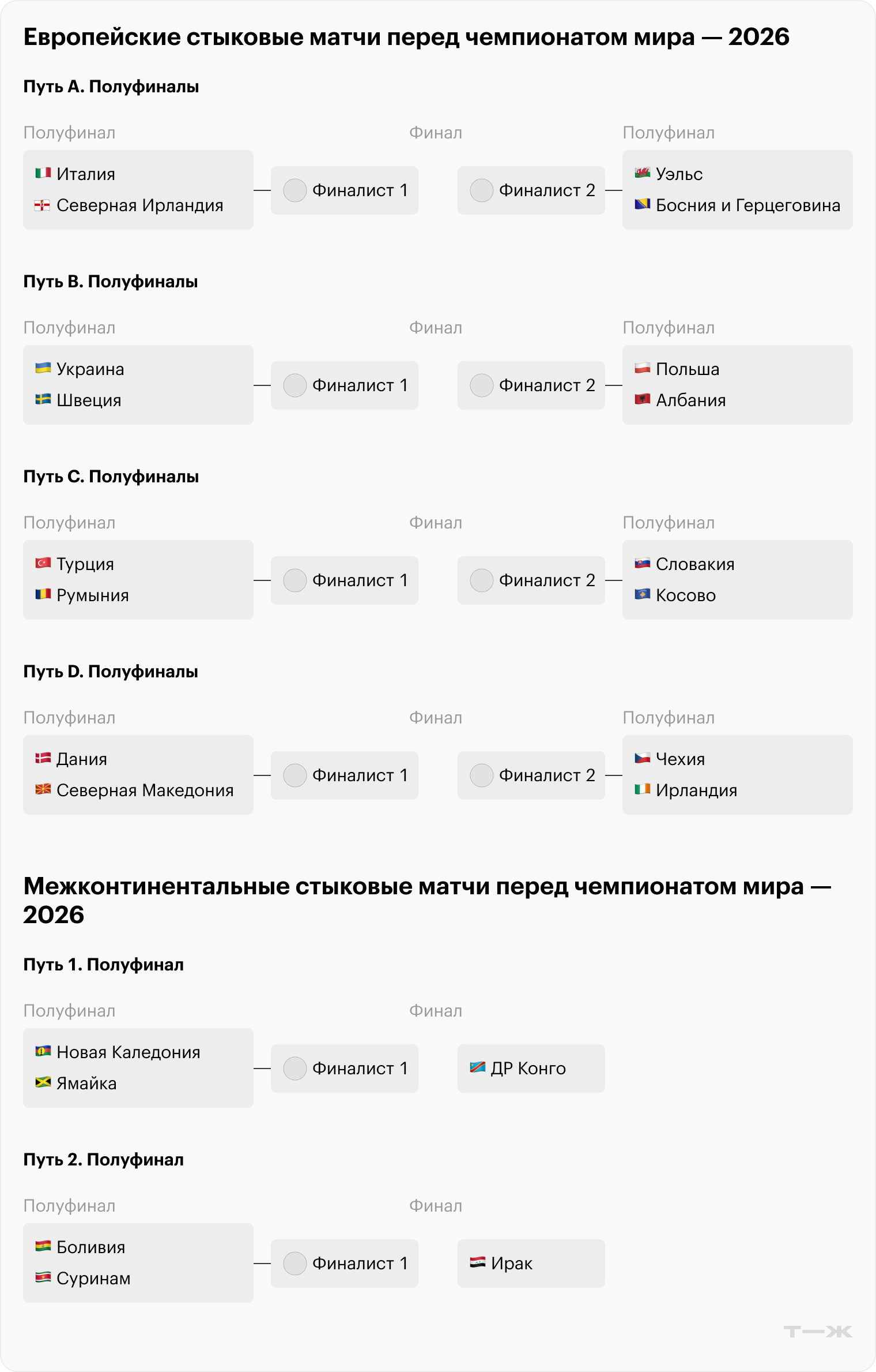 Стыковые матчи. Сейчас известны 42 из 48 участников чемпионата мира. Еще шесть путевок распределят в стыковых матчах. 16 европейских команд разыграют четыре. Еще два места поделят шесть сборных остальных континентов. Матчи пройдут в конце марта.