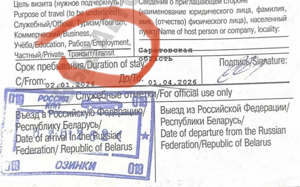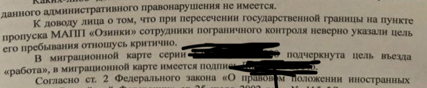 Неправильную цель въезда моего мужа указали пограничники на миграционной карте (там это впечатано машинным способом). Сам мой муж подал уведомление о прибытии именно с частной целью въезда, и это уведомление 05.01.26 нашими миграционщиками было принято, и они выдали об этом документ (отрывная часть).