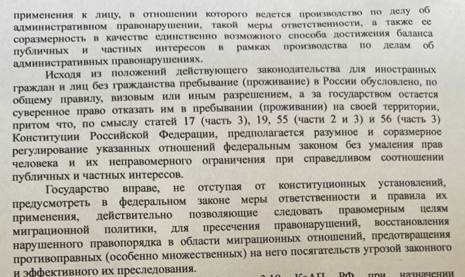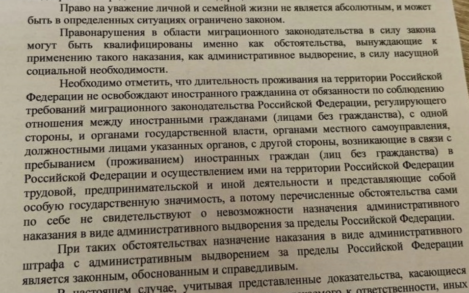Начальник отдела в своем постановлении о выдворении пишет, что право на семью не является универсальным, и если наша семья действительно крепкая, то мы прекрасно проживем в любой другой стране мира кроме Российской Федерации. Разве такими рассуждениями должен заниматься начальник отдела миграции?