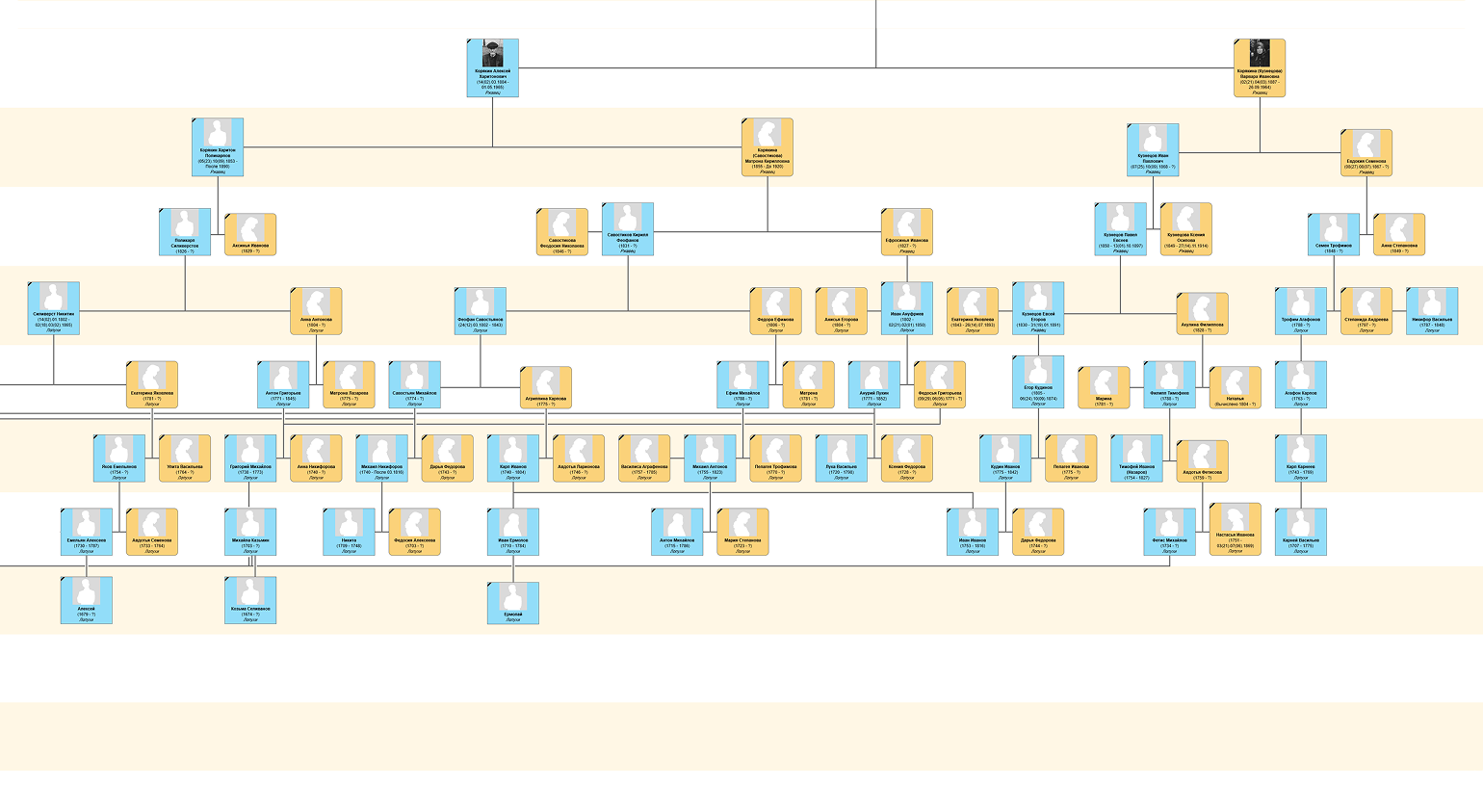 🌳 Составьте семейное древо. Внесите максимум уже известной информации: полные имена, девичьи фамилии, основные даты, места рождения, смерти и захоронения. Если не знаете чего-то — сразу составьте список таких белых пятен: он пригодится, когда вы обратитесь за уточнениями к родственникам. Можно делать это на бумаге или сразу попробовать генеалогический софт.