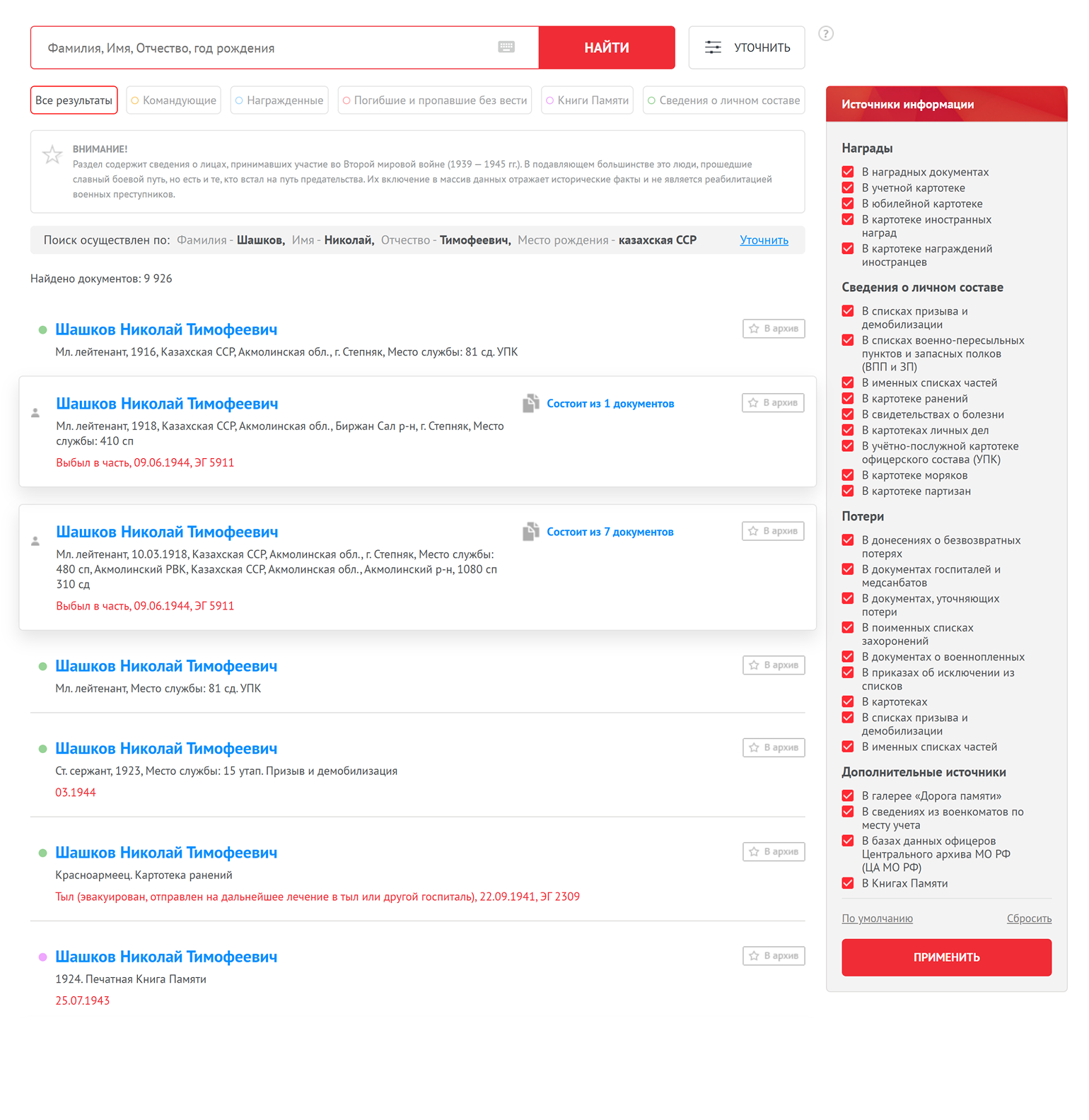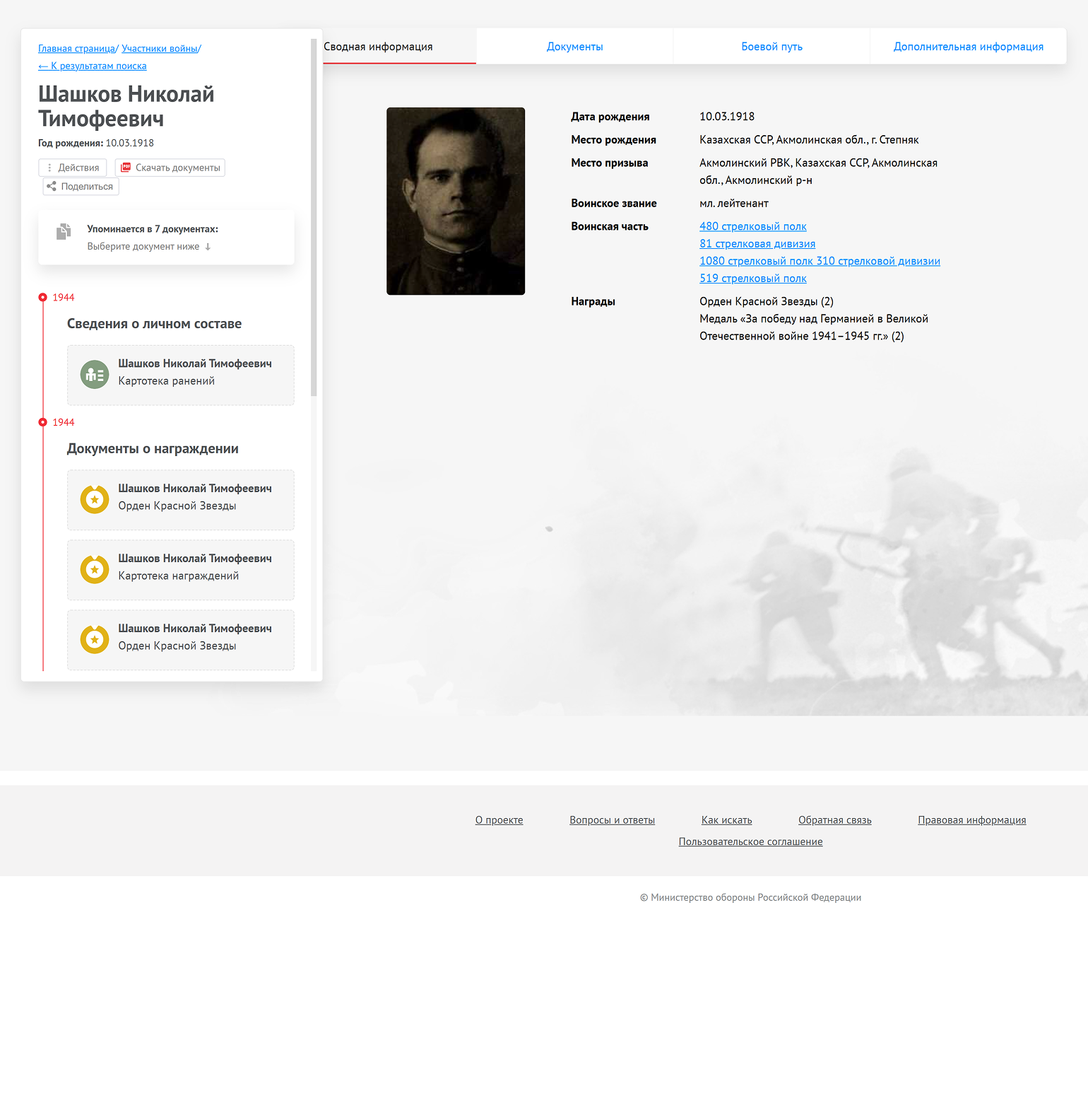 На сайте опубликованы сканы документов из архива Минобороны, его филиалов, военкоматов и других учреждений. Это далеко не весь массив документов об участниках боевых действий. Но в большинстве случаев этого достаточно, чтобы найти хоть что-то о воевавших родственниках.