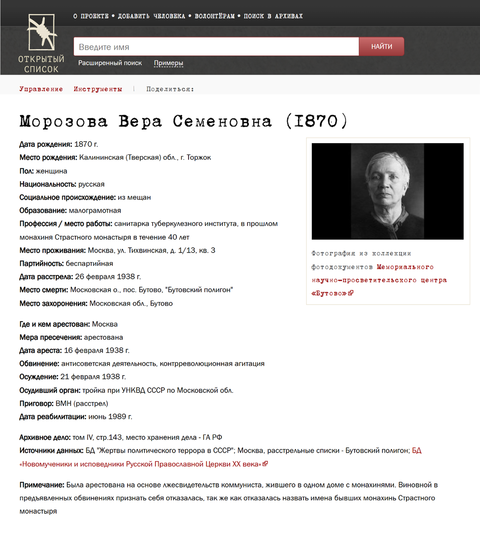 Эта база создана на основе Книг Памяти жертв политических репрессий и пользовательских данных. В них едва ли удастся найти сканы архивных дел, зато можно встретить краткие выжимки из документов — кто, когда и где был осужден по политической 58-й статье .