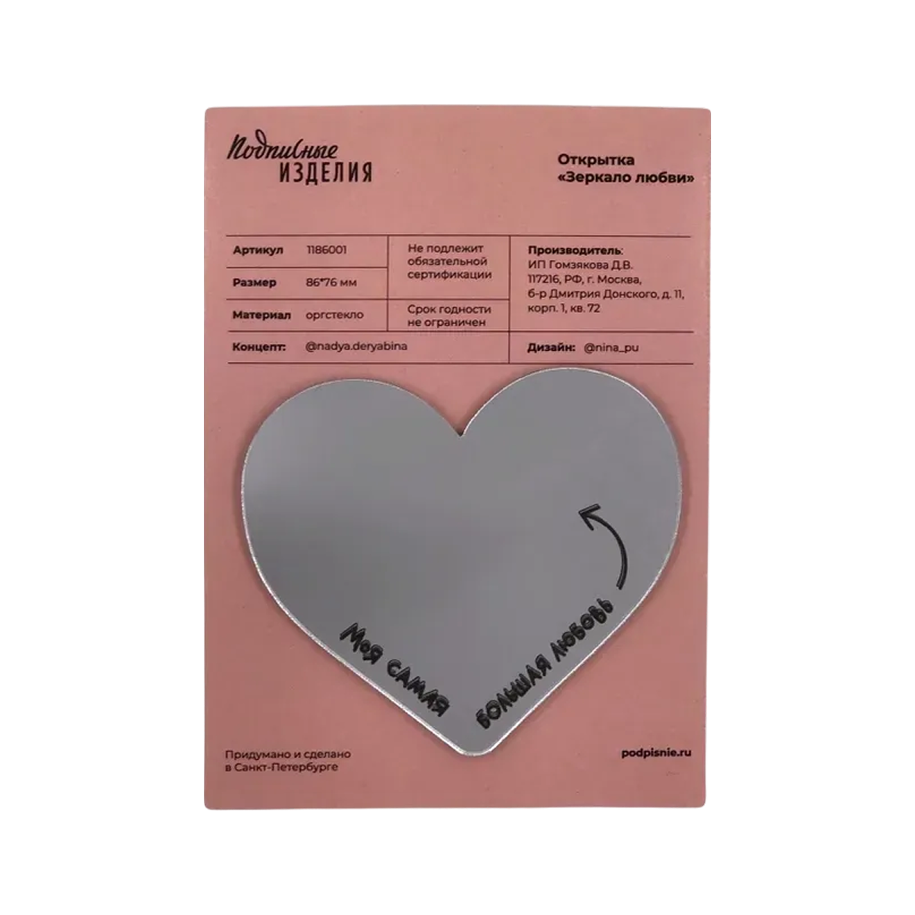 Эта зеркальная валентинка «Подписных изделий» не только очаровательная открытка, но и практичный аксессуар: ее можно положить в сумку и носить в качестве зеркала. Поэтому вместо одного дня она будет радовать адресата еще 364 дня в году.