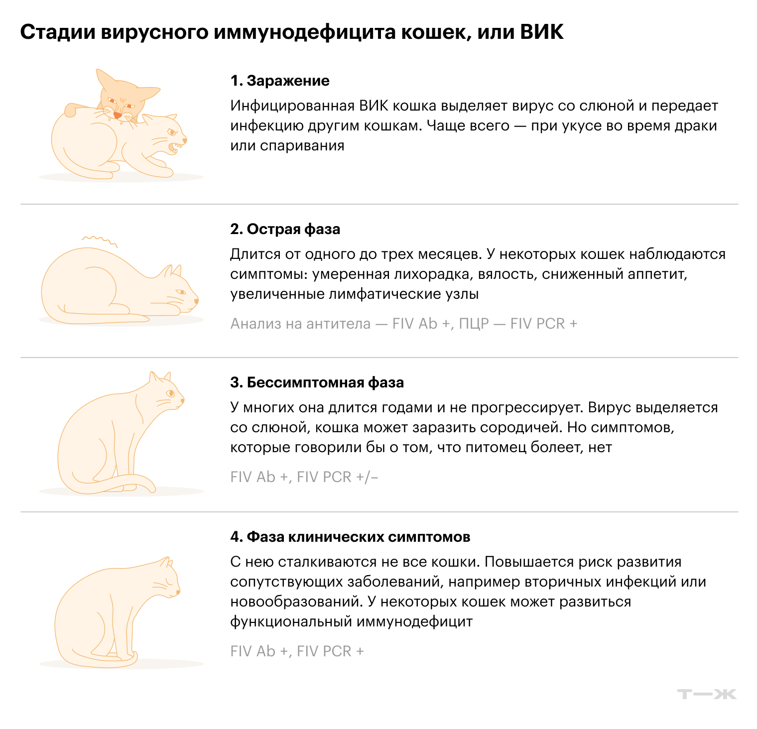 У ВИК принято выделять три стадии. Первые две проходят все инфицированные кошки. Третью, на которой развиваются сопутствующие заболевания, — некоторые из животных. Расскажу подробнее.