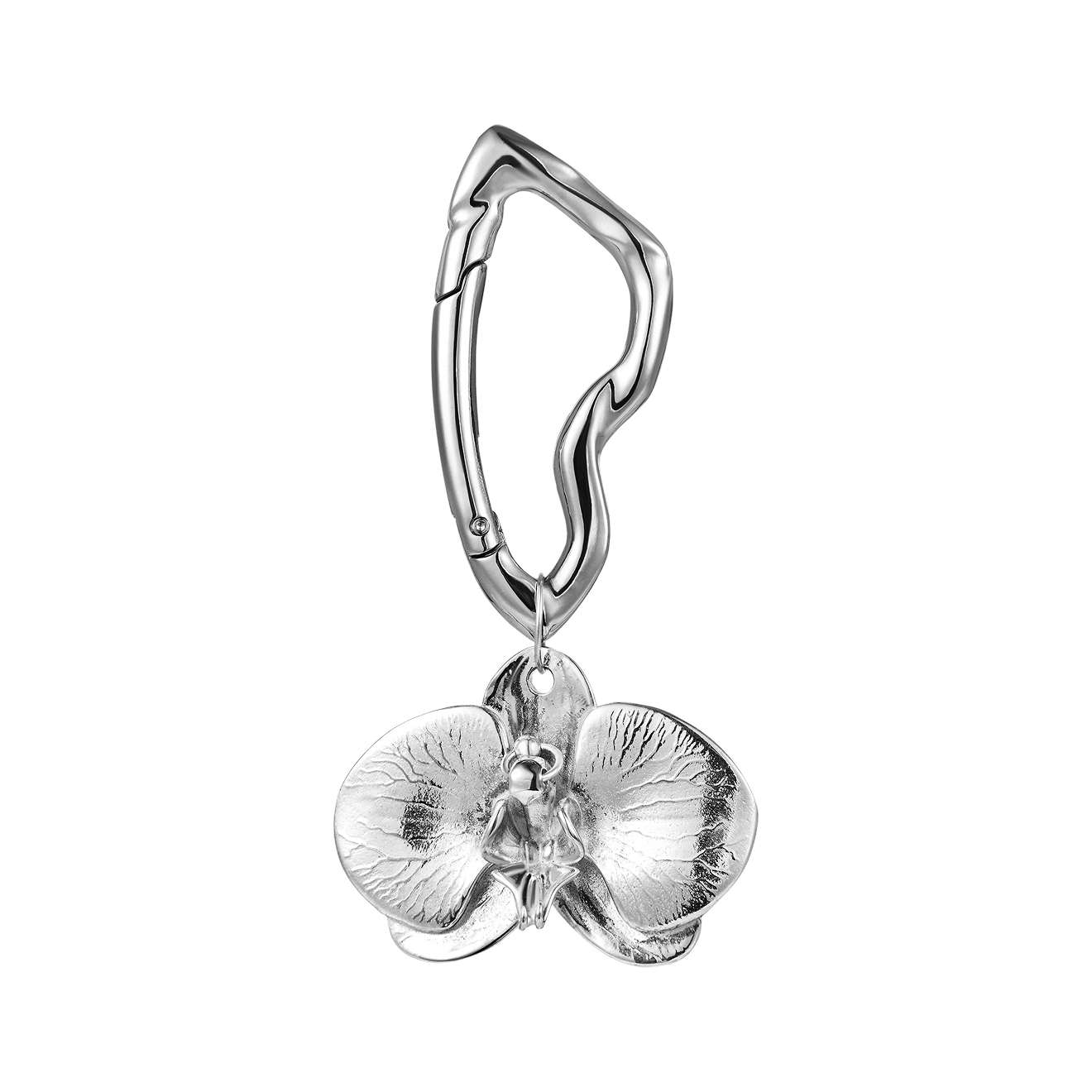 Как отличить перформативного мужчину от самобытного? По карабину! У второго он будет не для галочки, а для души. Как, например, этот вариант с орхидеей сентиментальных ювелиров Symptom. У карабина нестандартная изогнутая форма, выкованная из железа, а сам цветок — из ультрапрочного сплава меди, никеля и цинка