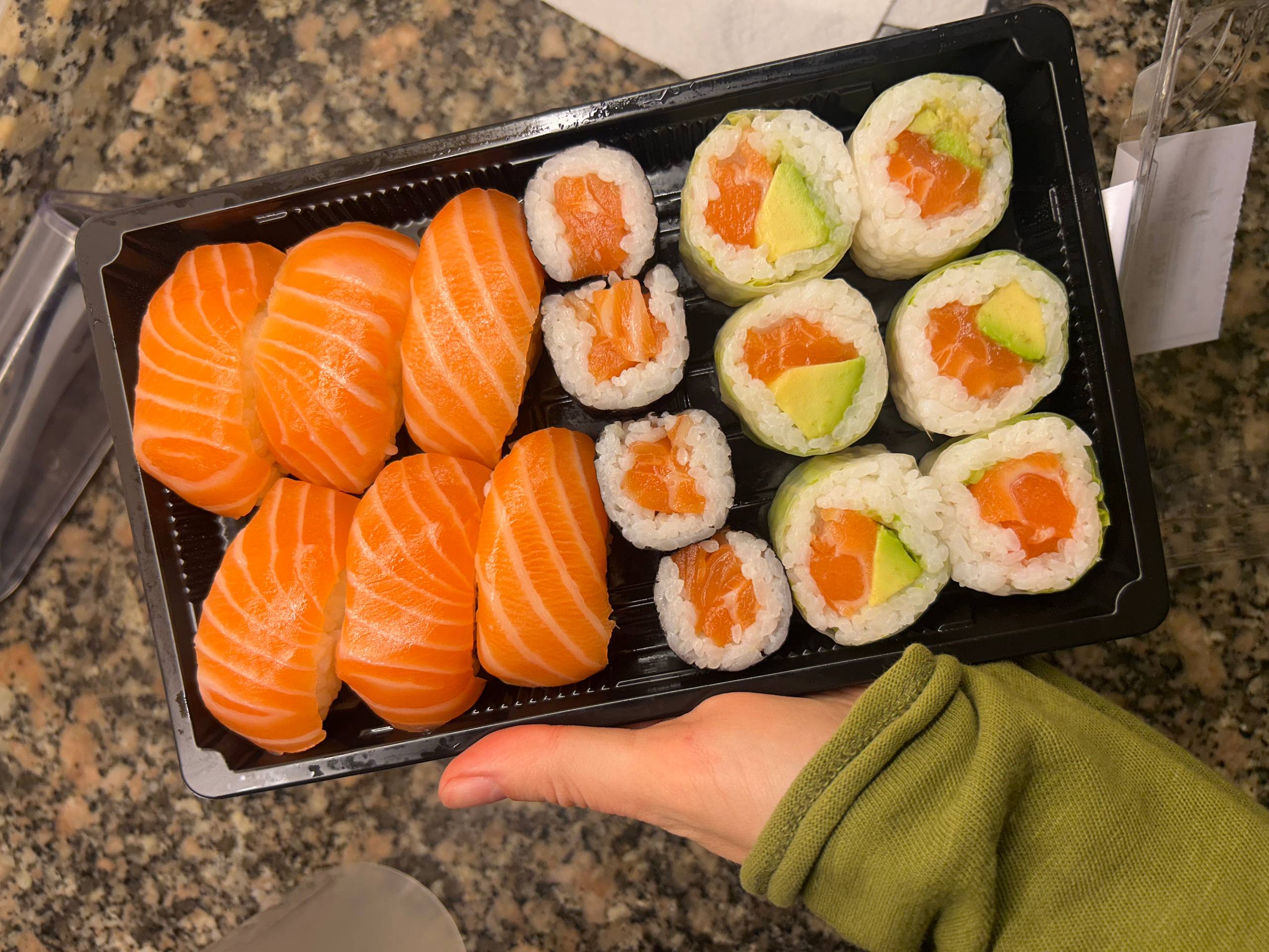 Также примерно раз в неделю покупаем роллы в Eroski, их прямо в магазине крутят из свежайшей рыбы. Упаковка весом в 400 грамм стоит 14 евро.