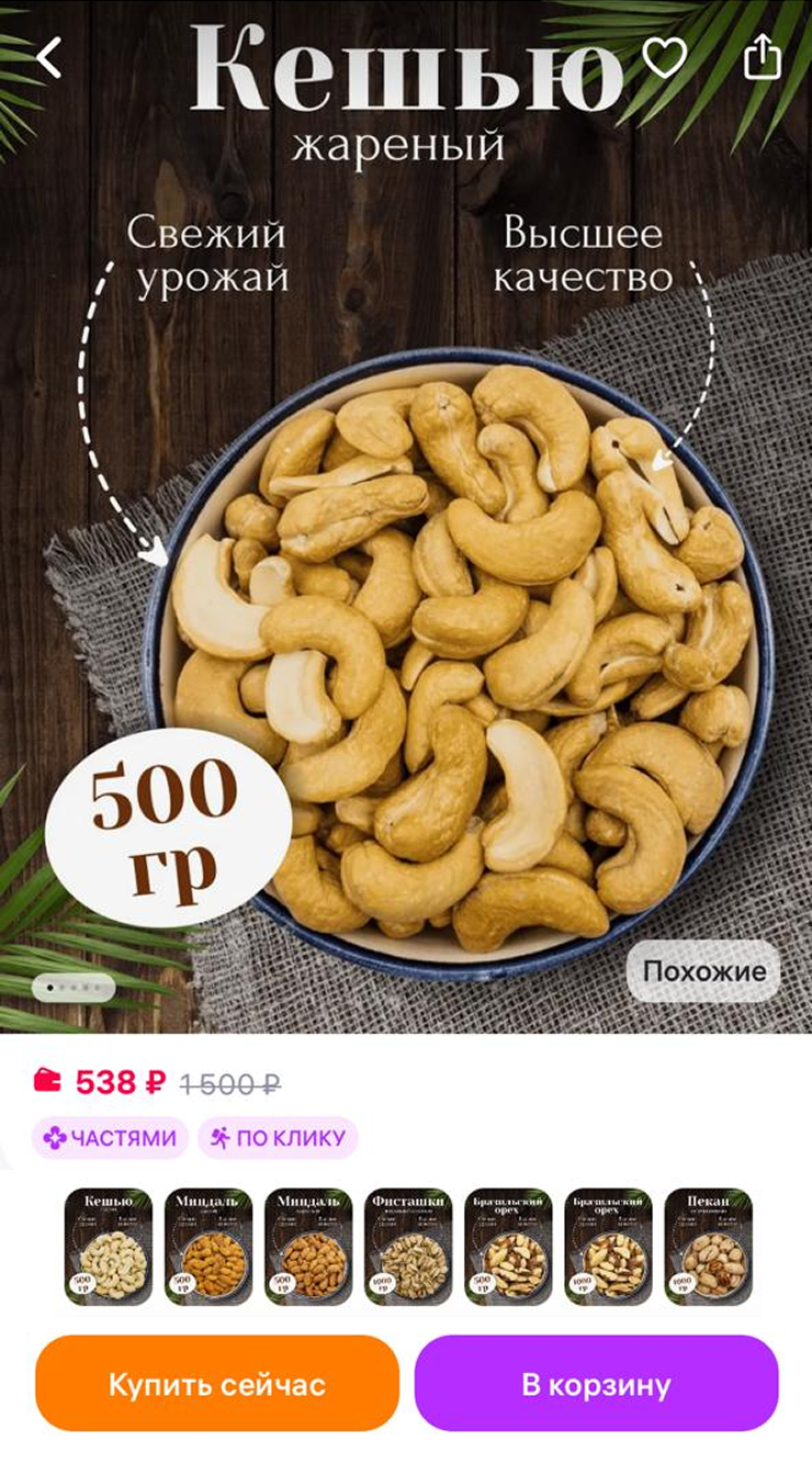 Продукты для перекусов покупаю сразу большими пачками. На Wildberries заказываю килограмм кешью или миндаля, кладу орехи в маленькие контейнеры и ношу с собой на работу. Также беру батончики из белевской пастилы — упаковка из 15 штук стоит около 550 ₽, хватает почти на месяц.