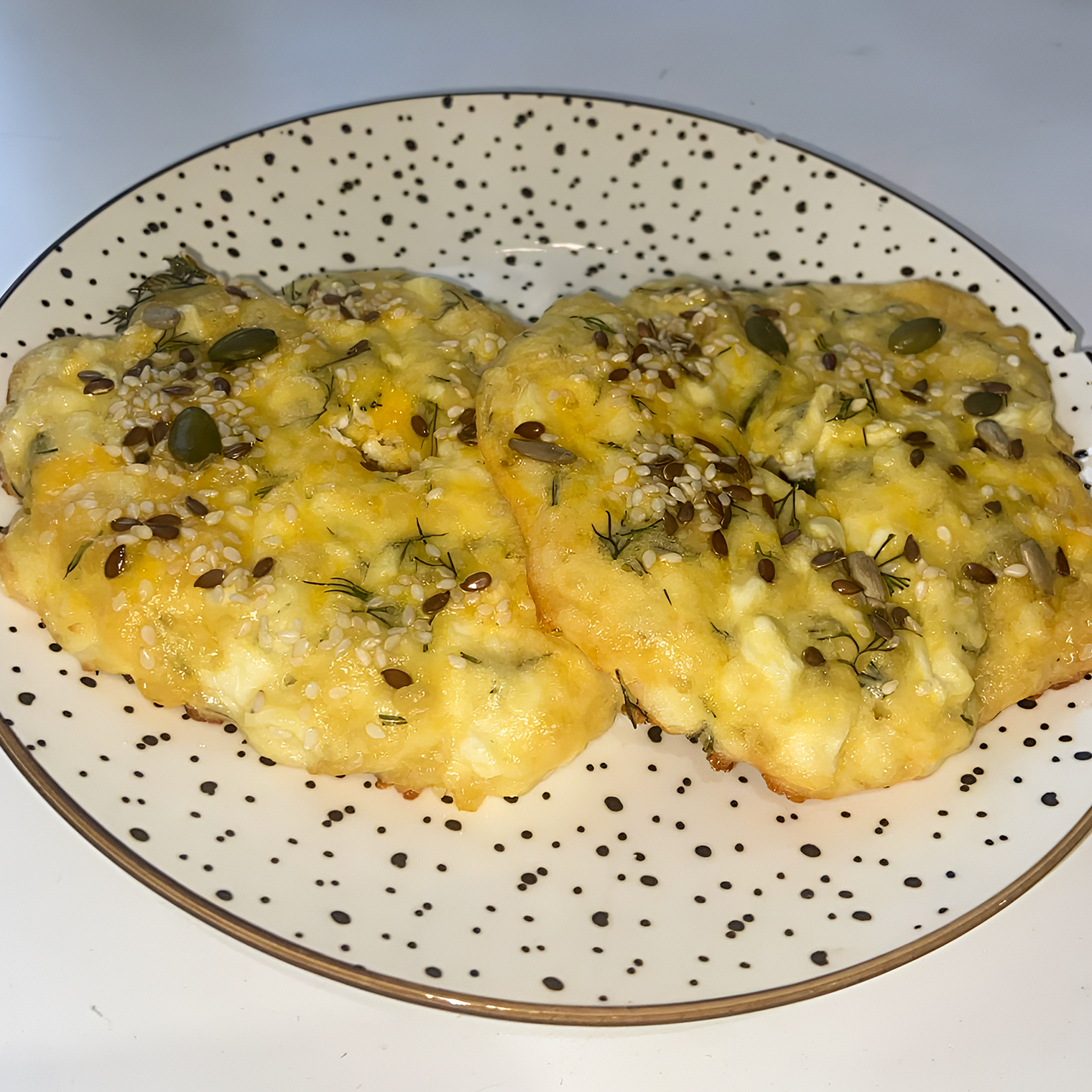 Завтраки чаще всего готовлю вечером накануне — в основном что-то в духовке. Делаю булочки, лепешки или оладьи, с утра разогреваю. Ингредиенты обычно одни и те же: яйца, сыр, рисовая мука, греческий йогурт плюс творог либо кабачки. Если приготовить заранее не успеваю, варю яйца и беру нутовые хлебцы.