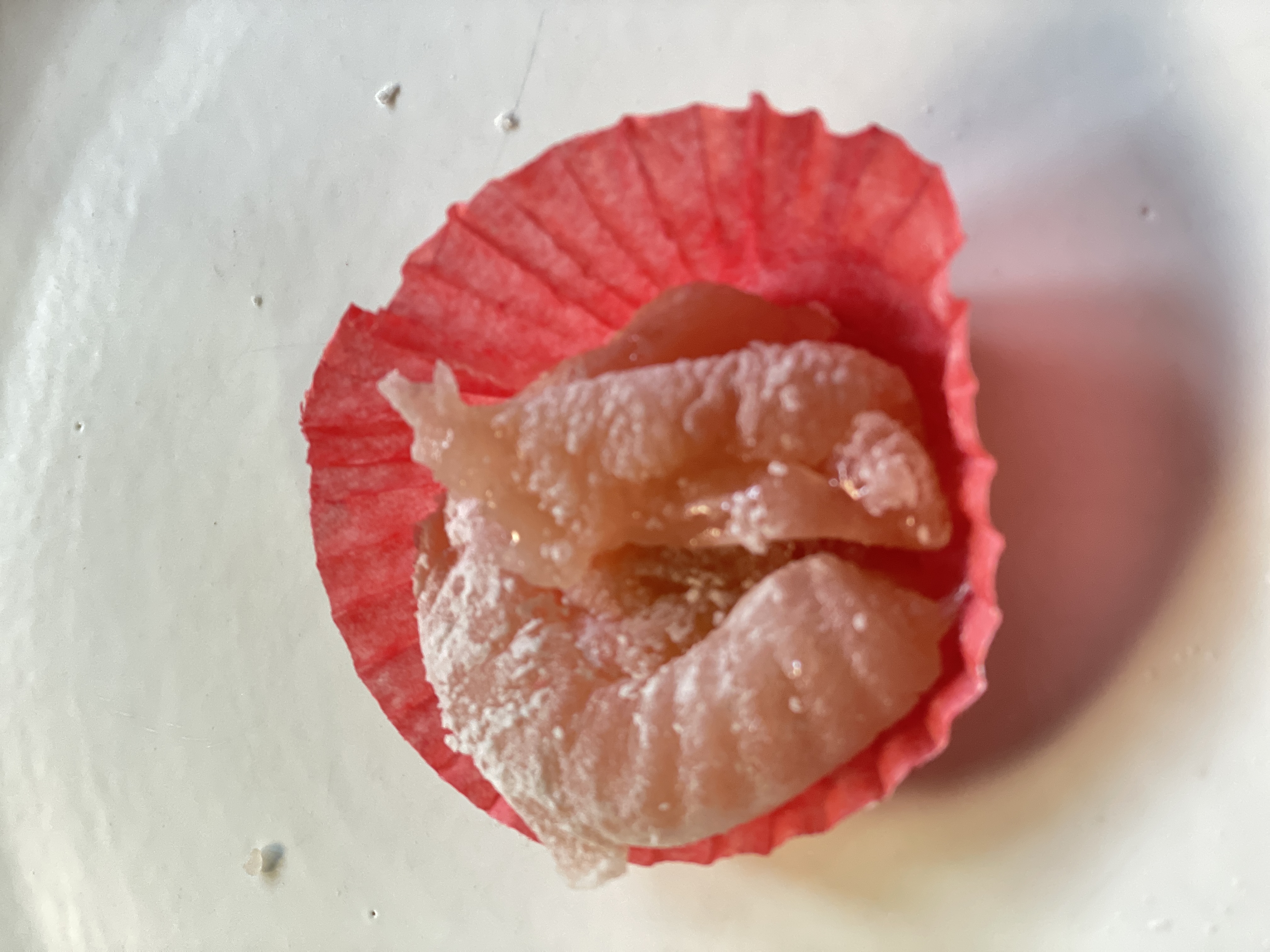 Моти из достатки «Озон.фреш», Москва. Имеет блекло-розовый, пудровый цвет. Форма округлая, но поплывшая. Суть Моти, что оболочка из рисового теста обволакивает начинку. Благодарю чему, очень приятно и нежно кусать моти.