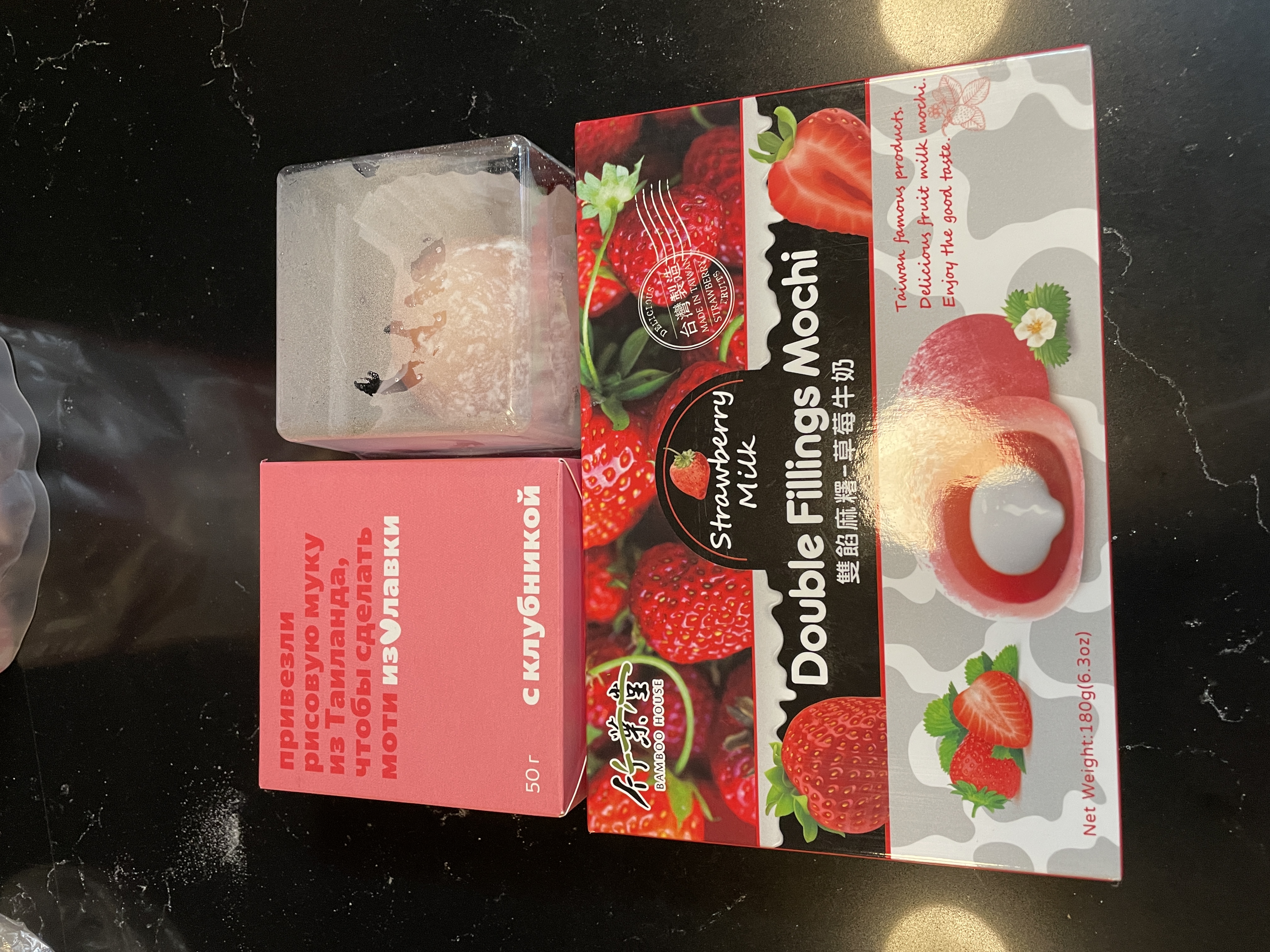 Double Filling Mochi, Тайвань. Самыми необычными на вкус оказались «Моти» из Тайваня. Они действительно со вкусом бобов, есть жидкий центр, при этом больше тоже похоже на желейные конфетки, чем на моти в привычном понимании. Клубника особо не чувствуется. Цвет пудрово-розовый.