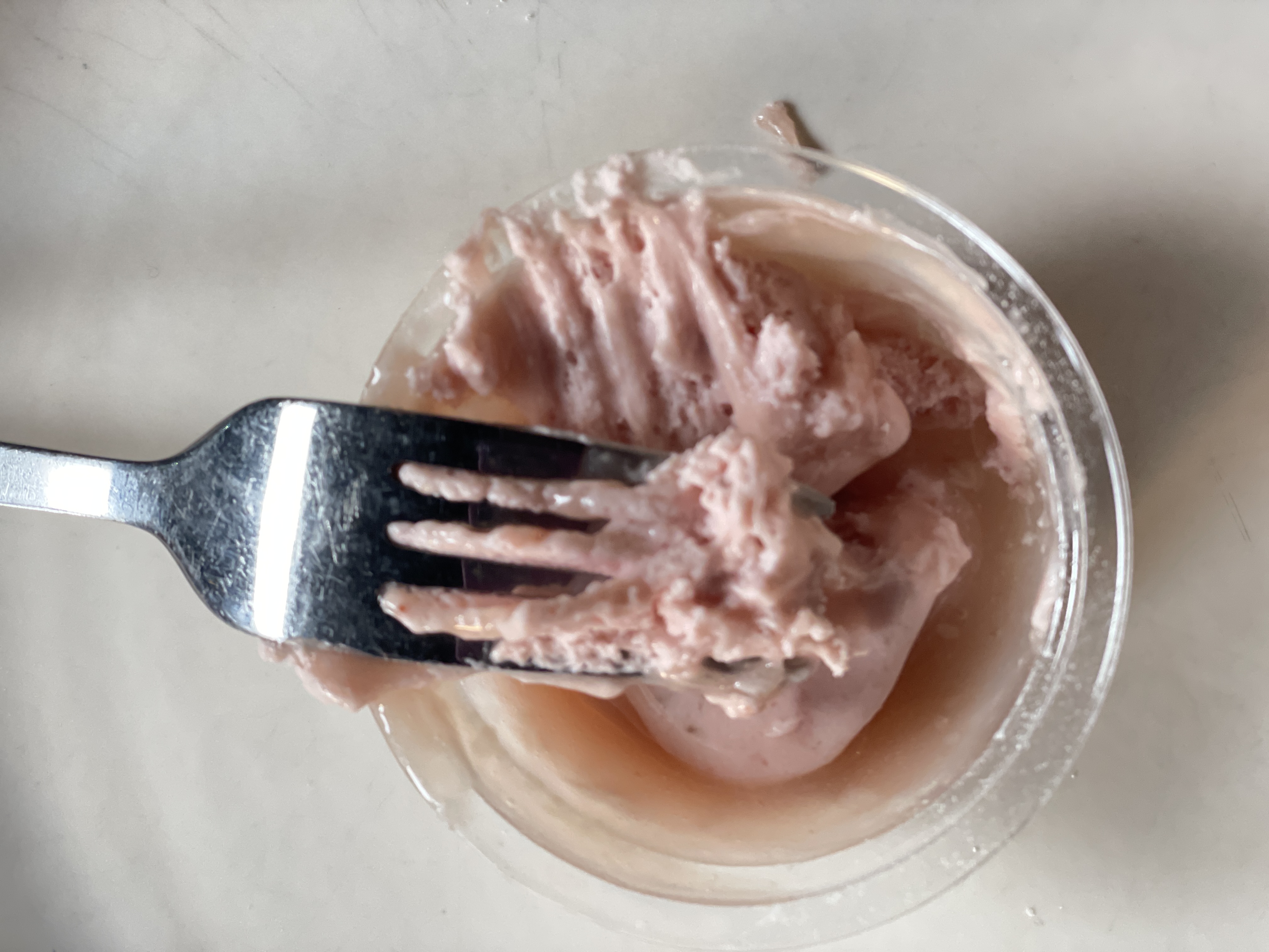 Моти со вкусом клубники из «Самоката», Москва. Самое важное, что спустя 15 минут после того, как мы достали десерты, они потеряли форму и растеклись.. выглядят жутко. Если бы не пластиковый мини-стаканчик, в котором лежит «моти», все вытекло бы из коробки. Соответственно творожный центр остался, а рисовая оболочка стекла, как снег с горы сходит.