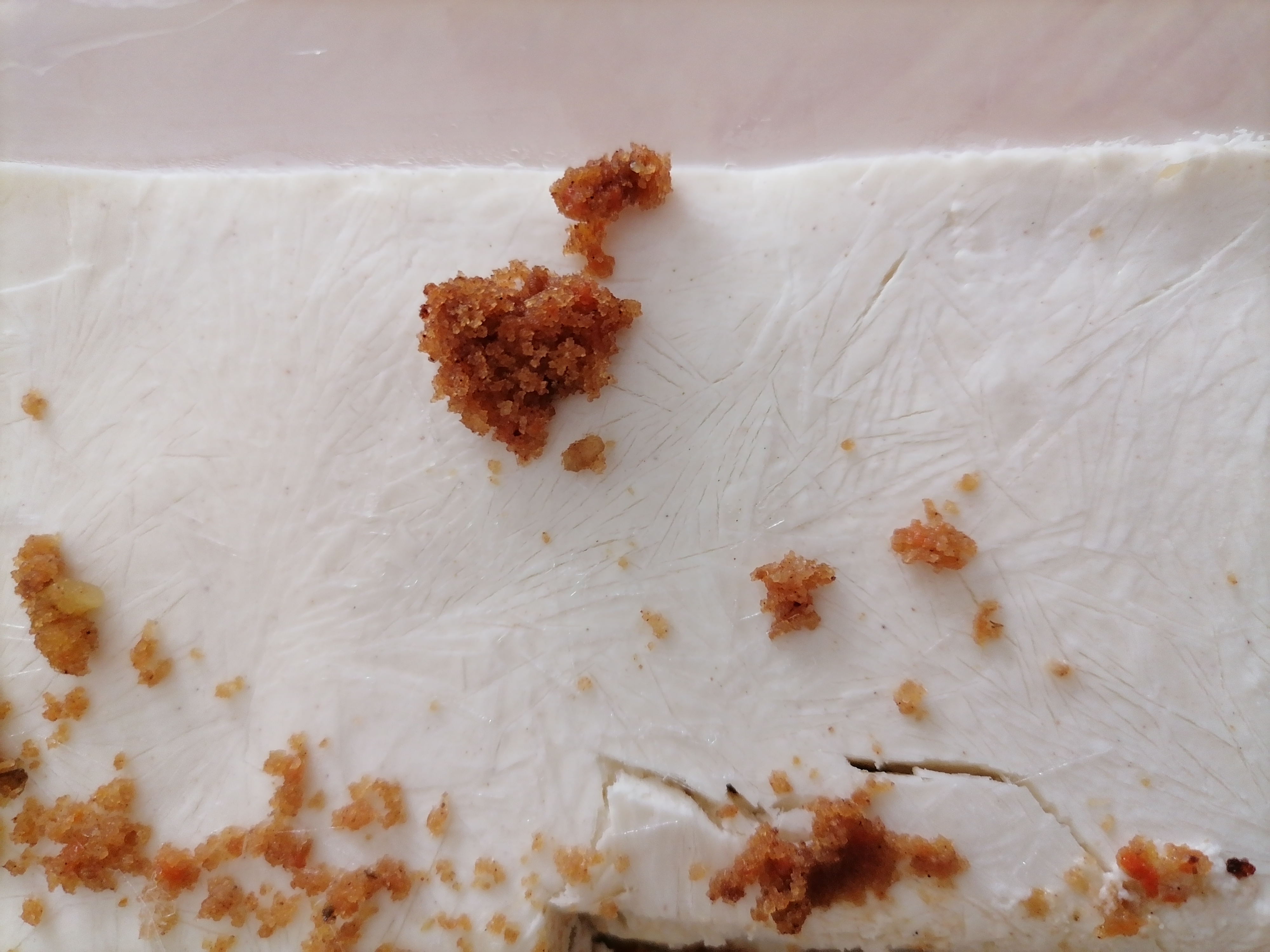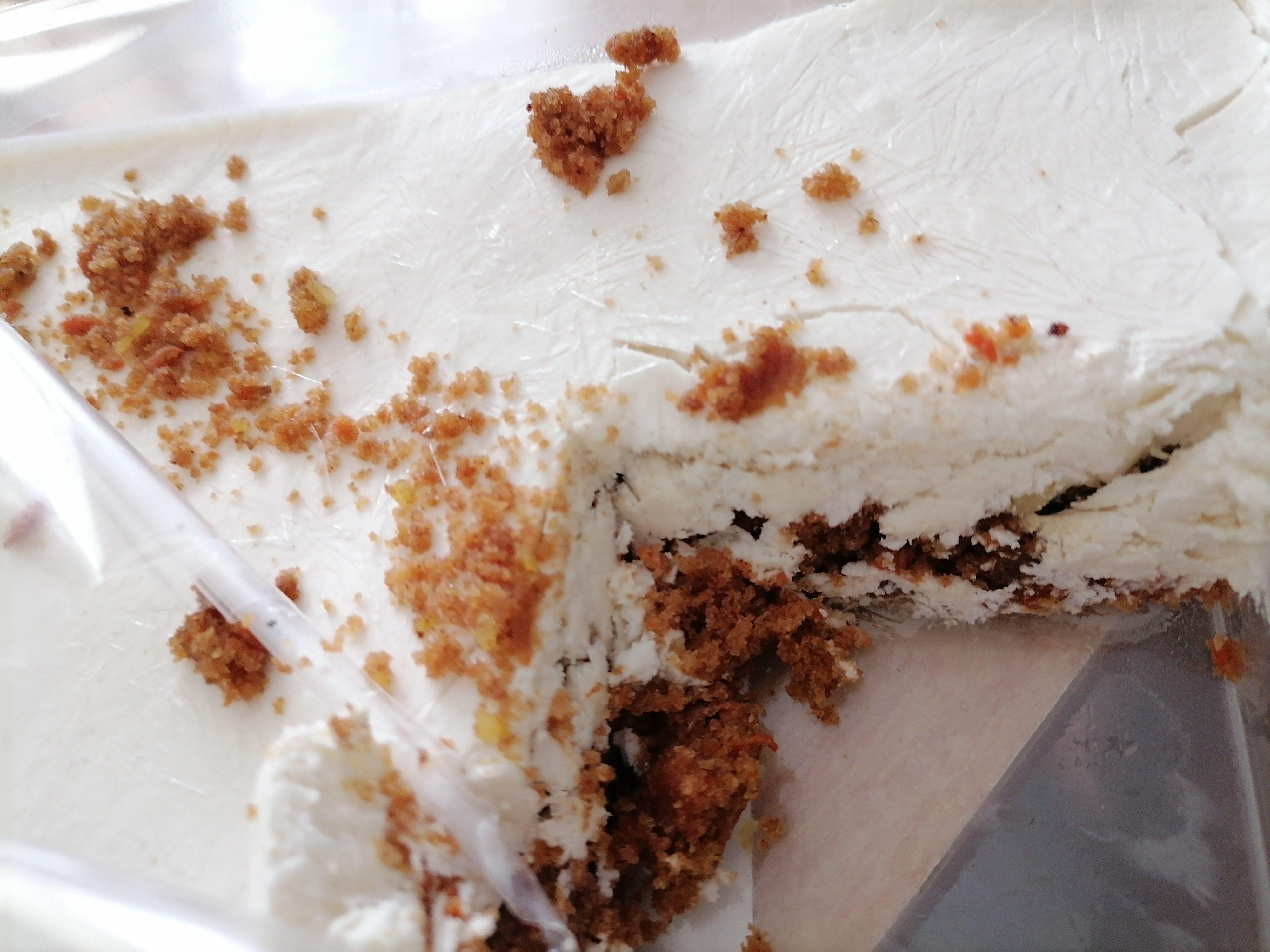 Два слоя: в первом кусочки бисквита, второй творожно- сливочный. Во вкусе натуральные сливки, лёгкий привкус корицы, в коже кусочки морковки, но их немного, и орехи. Десерт сладкий, но в меру, говорю как человек, который не ест сахар больше месяца, и почти вся обычная еда для меня уже воспринимается достаточно сладкой, включая овощи и мясо. Сегодня любопытство победило, ради этого десерта отступила от своих ограничений.