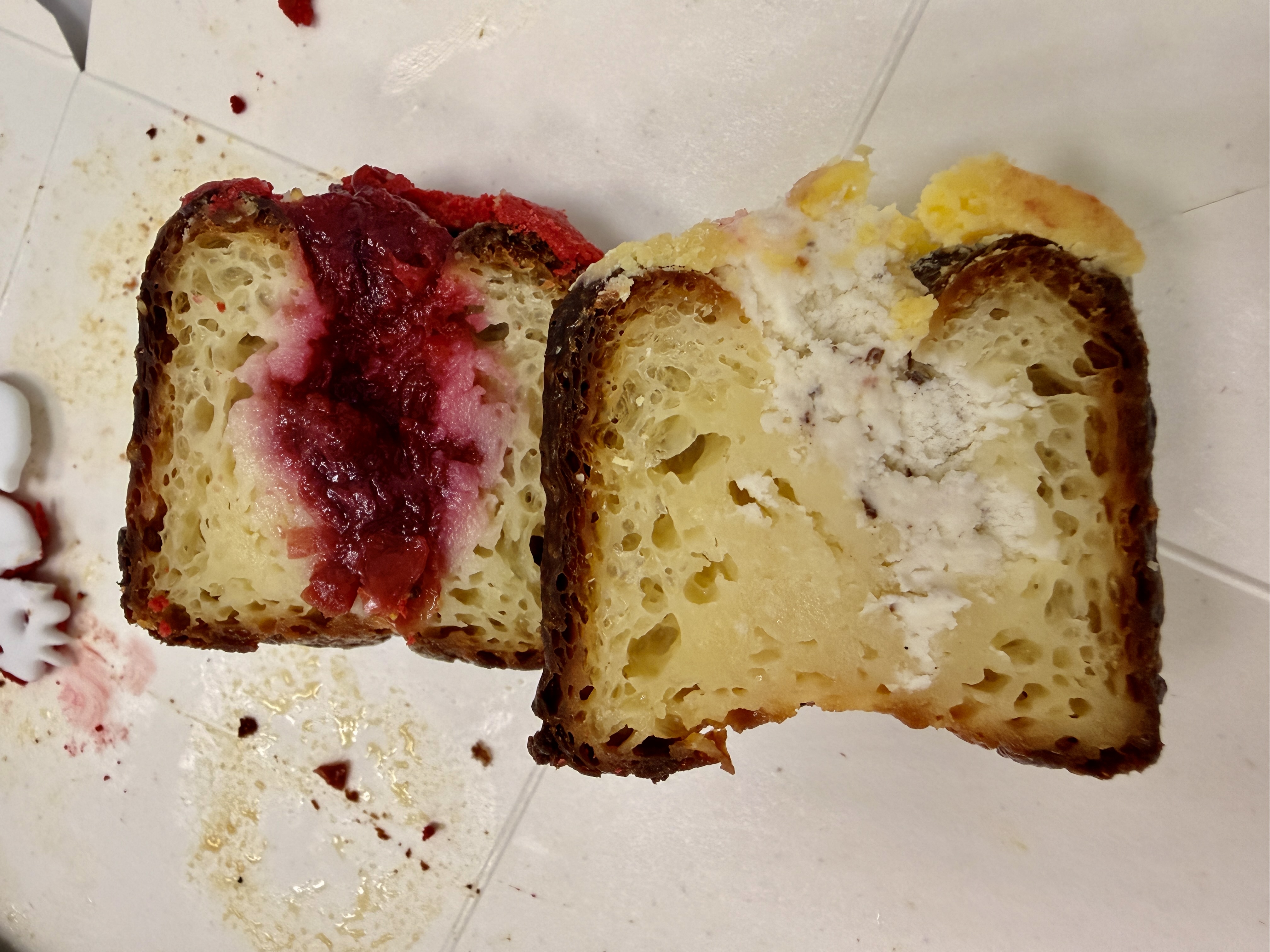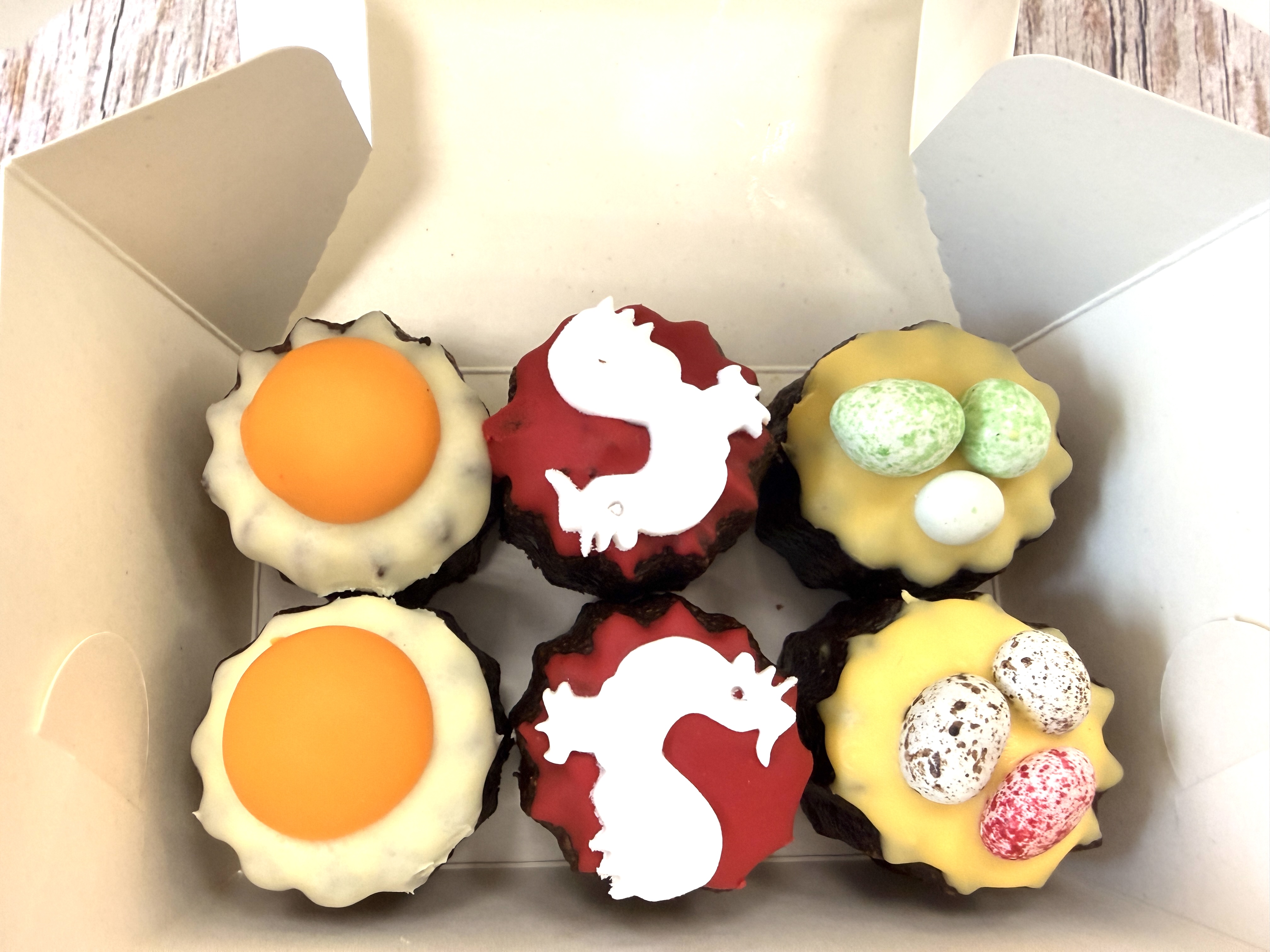 В коробочке было 6 штук трех вкусов. Мы разрезали пополам и начали изучать начинку. Внешний вид был пасхальный: на двух красный петушок, на двух яички крошечные в качестве декора и еще на двух сверху словно яичный желток.