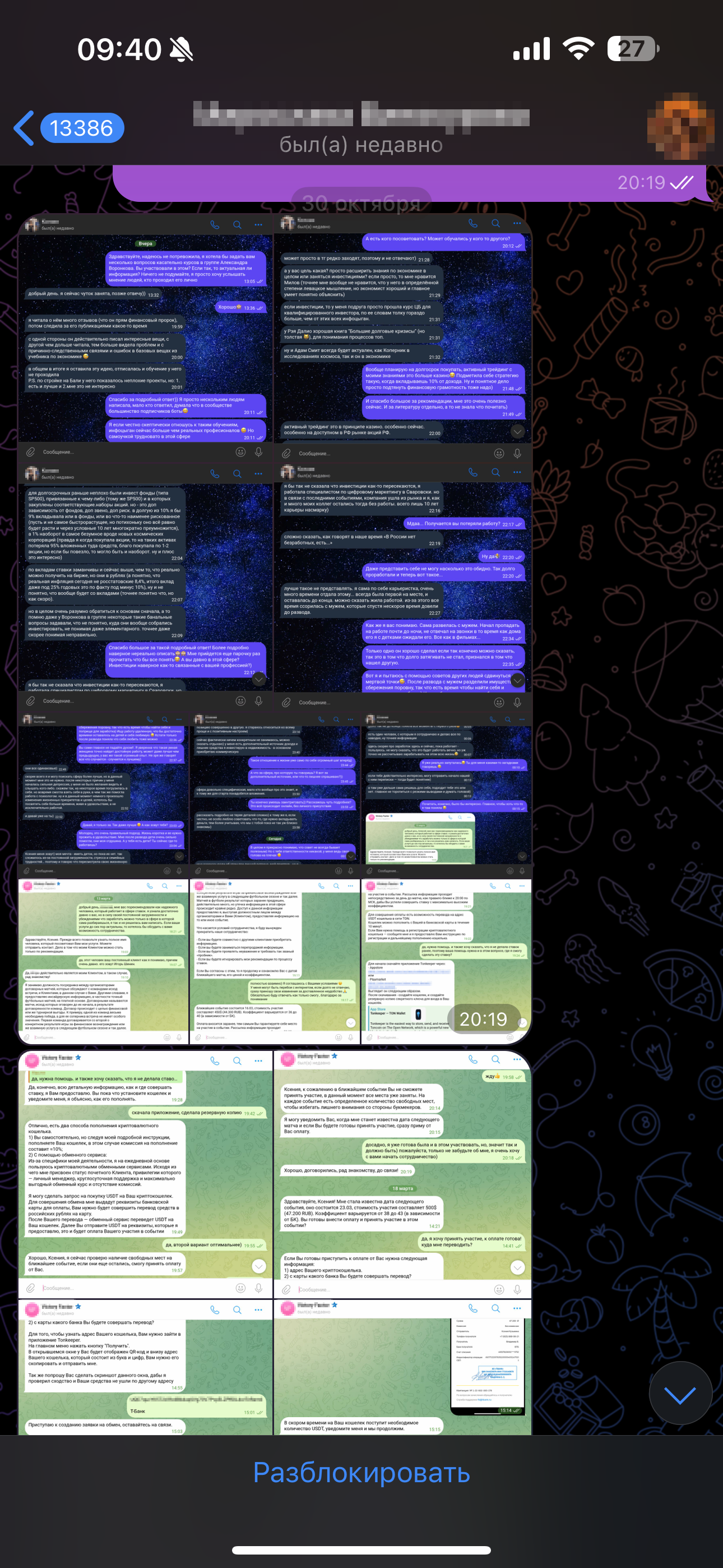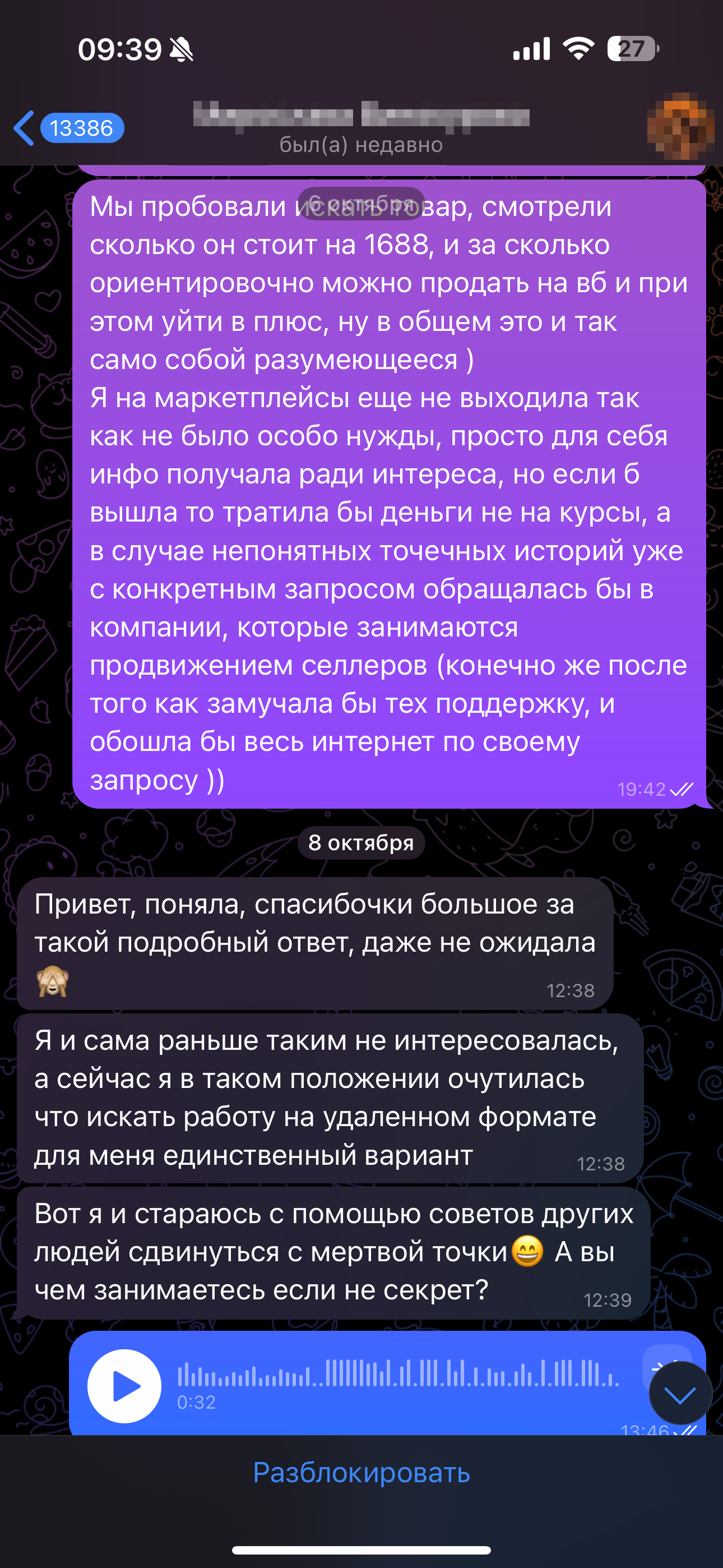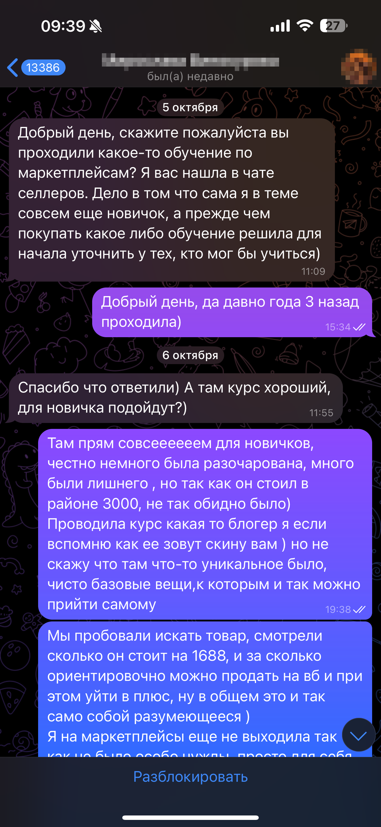 Мне написала девушка М. в телеграмм, якобы мы с ней вместе состоим в канале по продвижению вайлдберриз, и она пишет разным людям узнает информацию о пройденных обучениях чтоб самой тоже выбрать верное направление. Девушка очень приятна по общению и по началу ничего не предвещало беды.