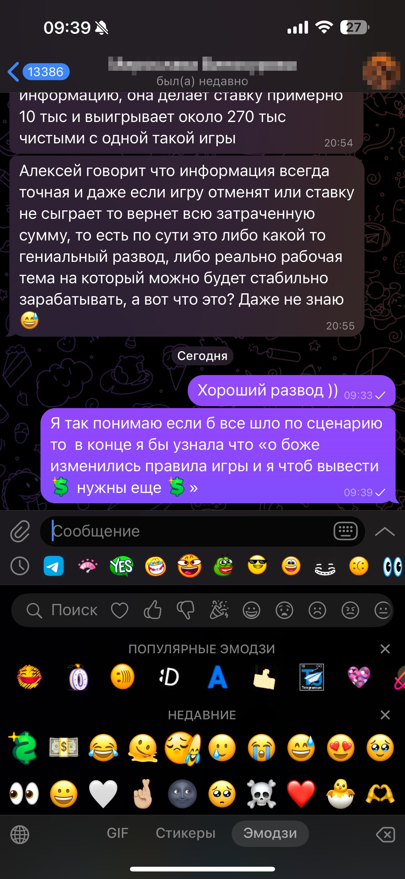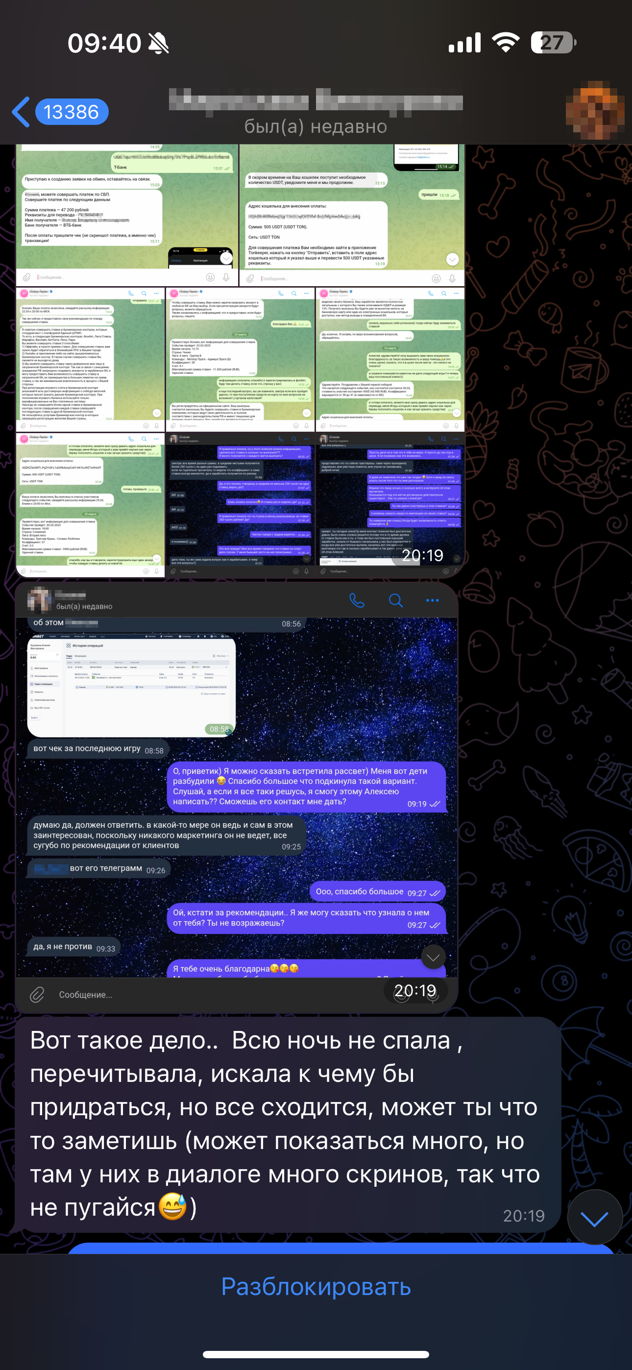 Но потом она как-то написала что так же как и мне написала еще одной девушке, и та рассказала ей, что зарабатывает на купленных ставках. М. все выстраивает так будто ей нужен от меня совет можно ли ей самой попробовать заработать как и ее новой собеседнице. Я искренне ответила что думаю по этому поводу, но дальше поняла что разводят не Мирославу, а меня.
