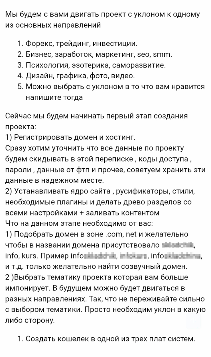 Прошло 6, 10, 12 часов, я уже начала нервничать, подумала: «Ну все, кинули, но неужели так примитивно-то?» Но нет, спустя ровно сутки админ обрадовал-таки меня письмом, в котором рассказал, что нужно сделать в первую очередь. Выбрать тематику проекта из нескольких предложенных, зарегистрировать домен и хостинг, создать кошелек в одной из платежных систем и новые учетные записи в Google и «Яндексе».