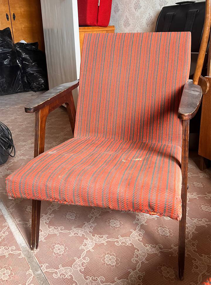 Кресла мы отреставрировали: разобрали их с помощью отвертки, отковырнули скобы, а гвозди вынули плоскогубцами. Раньше мягкую мебель набивали тряпками и ватой — все это за десятилетия сгнило. Мы выкинули старую обивку и наполнитель. Ручки обработали шлифовальной машинкой и покрыли воском.
