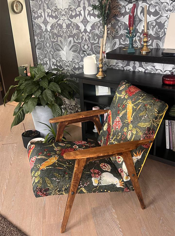 Для обивки одного кресла у меня оставался велюр, для другого заказали ткань на Wildberries — роскошный гобелен с попугаями. Заполнили кресло новым поролоном и обтянули все заново при помощи строительного степлера.
