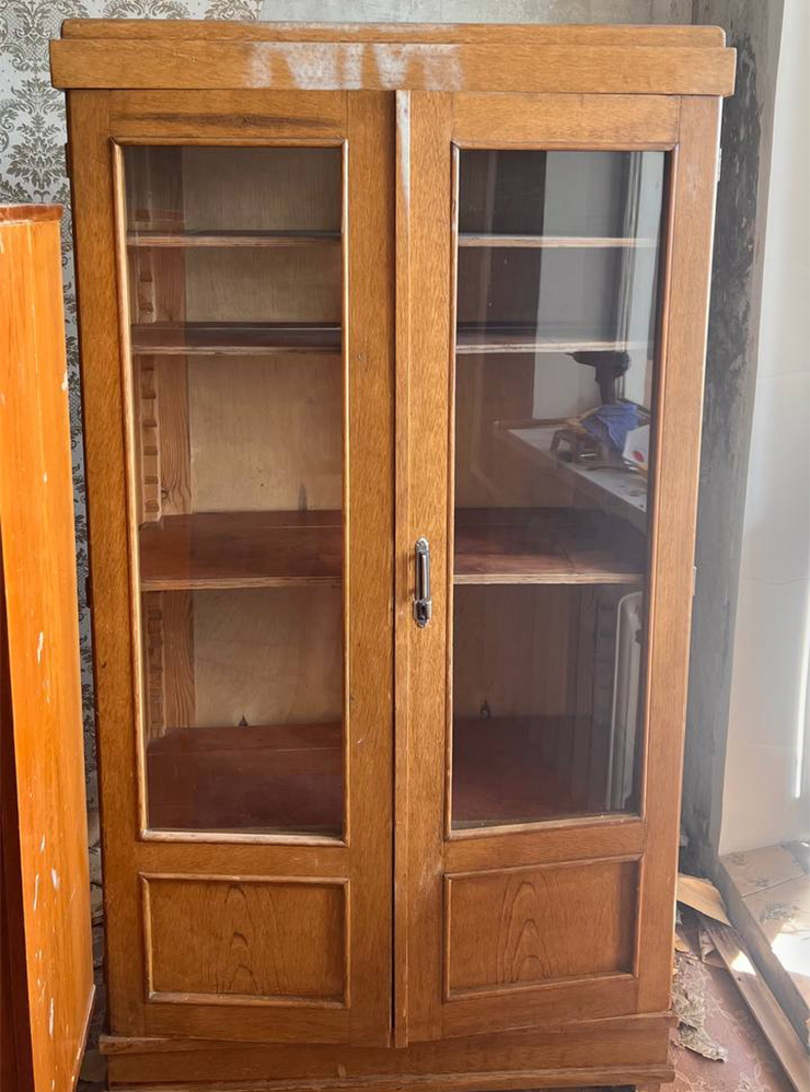 Книжный шкаф мы сразу покрасили в красный — без шлифовки. Затем немного затонировали темным воском, чтобы придать эффект старины. Всего на восстановления двух этих шкафов ушло три дня.