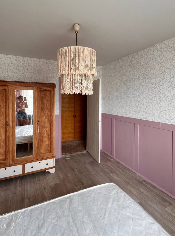 Верхнюю часть стены мы обклеили обоями. На комнату ушло два рулона — в сумме 4 900 ₽. Нижнюю часть стен хотели покрасить в коралловый цвет. Но когда купили колеры и сделали выкрас, поняли, что цвет плохо смотрится. Стали добавлять разные краски, которые у нас были, и делать выкрасы. В итоге пришли к цвету пыльной розы.