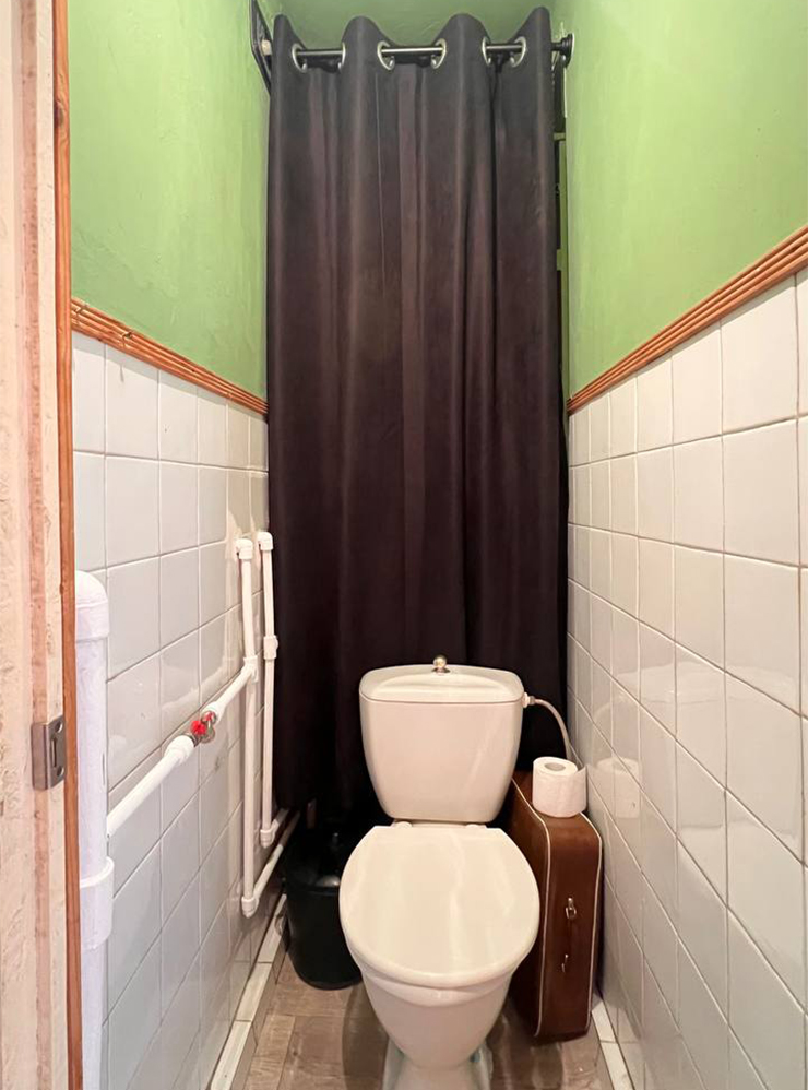Идеально было бы вызвать сантехника, чтобы он срезал лишние трубы, но это упиралось во время и деньги. Мы решили выдвинуть унитаз на 20 см, чтобы можно было повесить шторку на распорки под потолком. Так она закрыла бы шкаф и трубы, а еще визуально подняла потолок.