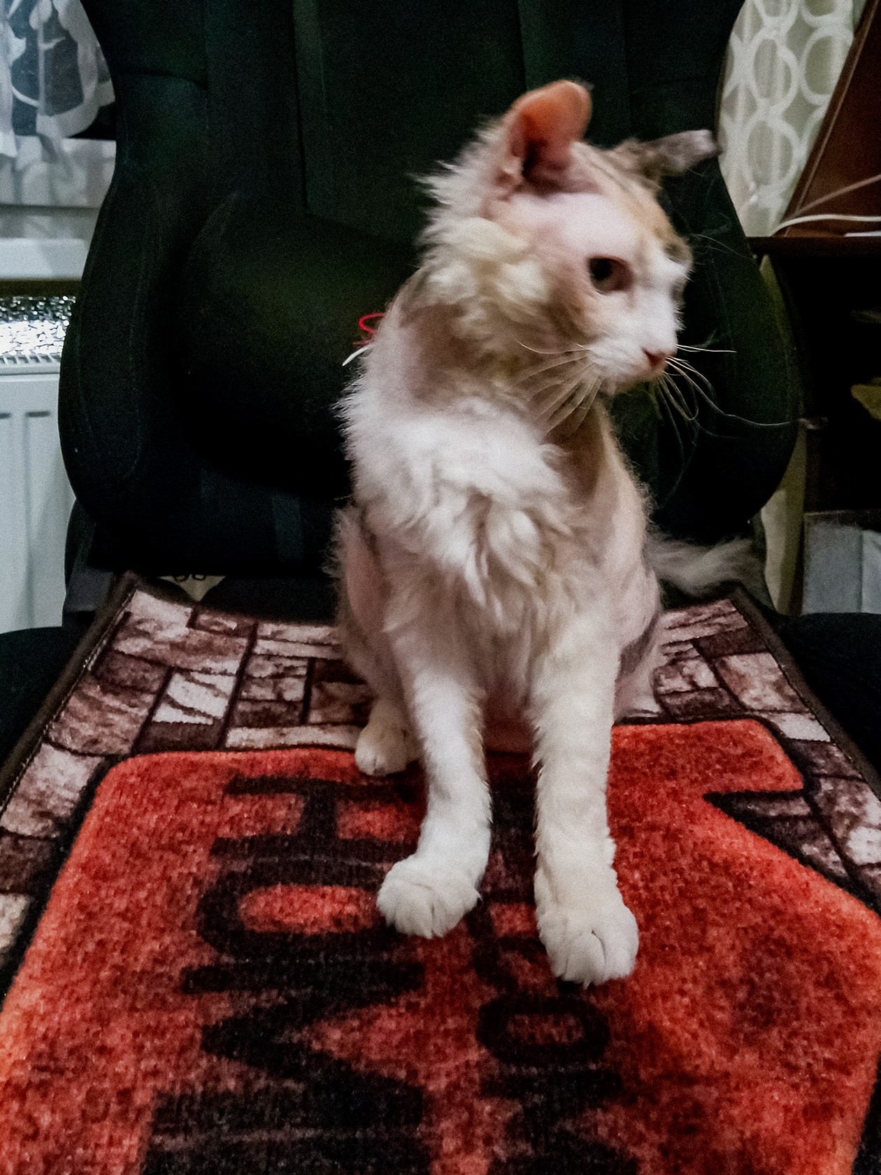 Еще утром после получения порции мягкого корма она подходит к двери комнаты, которая обычно закрыта, и громким мяуканьем настойчиво требует ее открыть. Потом обязательно входит в комнату и усаживается в мое кресло. Это ритуал: она отжала у меня кресло, хотя у нее есть три персональные подушки, две плетеные хлопковые корзины и очень симпатичный домик с шариком. Нет, подавай кресло — сидит как на троне.