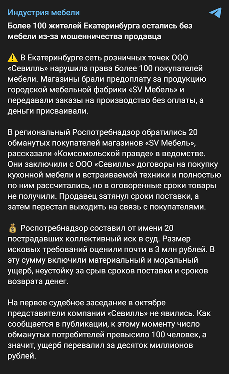 Я посмотрела судебную практику в некоторых судах общей юрисдикции в Екатеринбурге и Перми, где ответчиком выступает компания ООО «Севилль». Стало интересно, какие решения принимали суды, о каких суммах шла речь и как повели себя другие потребители, когда мебель не привезли.