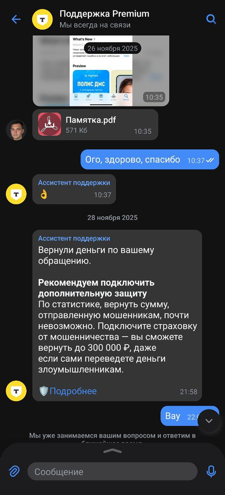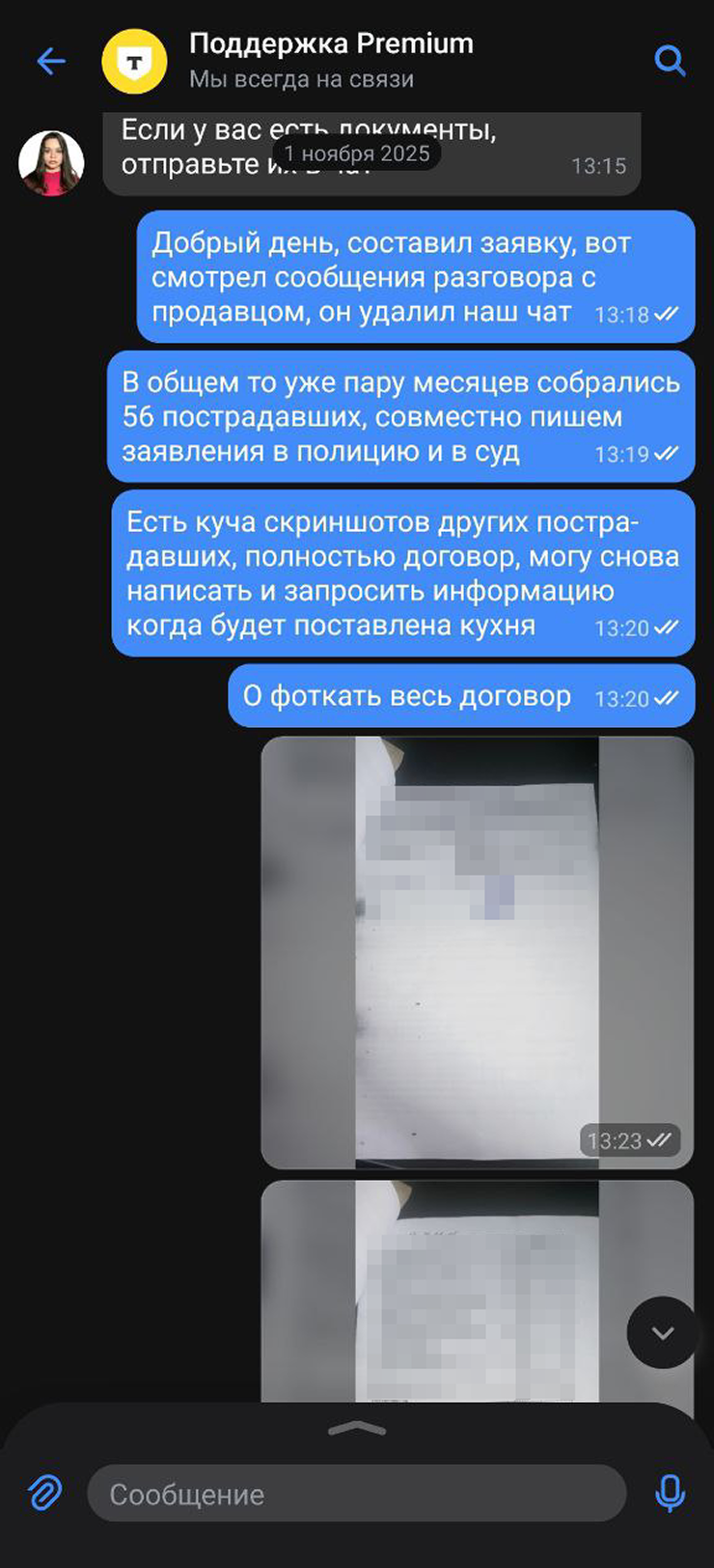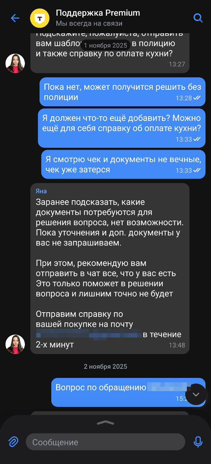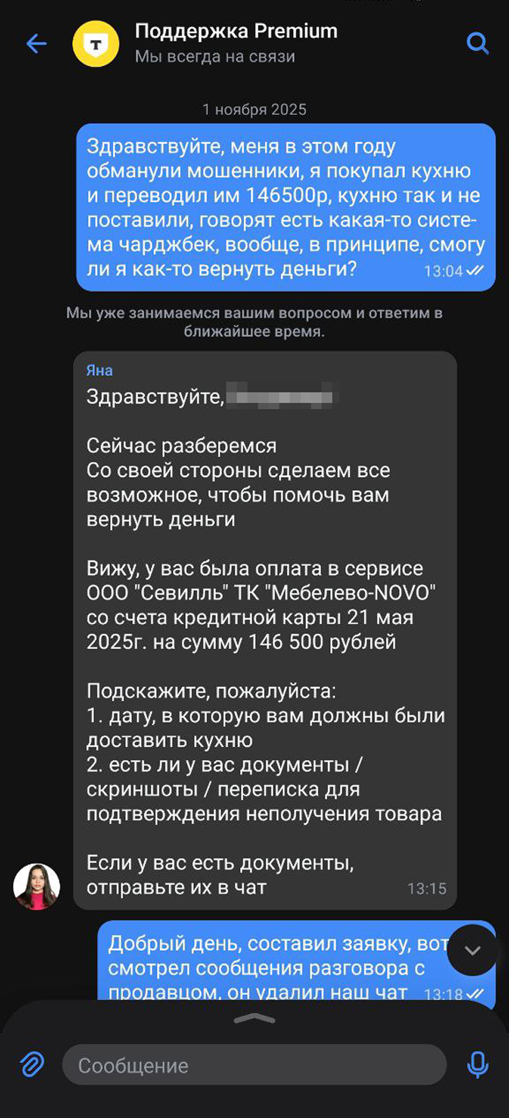 Сообщение в поддержку я написал 1 ноября — через три месяца после того, как кухню не привезли. Уточнил про чарджбэк и спросил, можно ли вернуть деньги. У меня запросили скриншоты переписки с компанией и договор, обещали по возможности помочь. К сожалению, чат продавец удалил, но документ у меня остался на руках — его и отправил. Дополнительные сведения не понадобились.