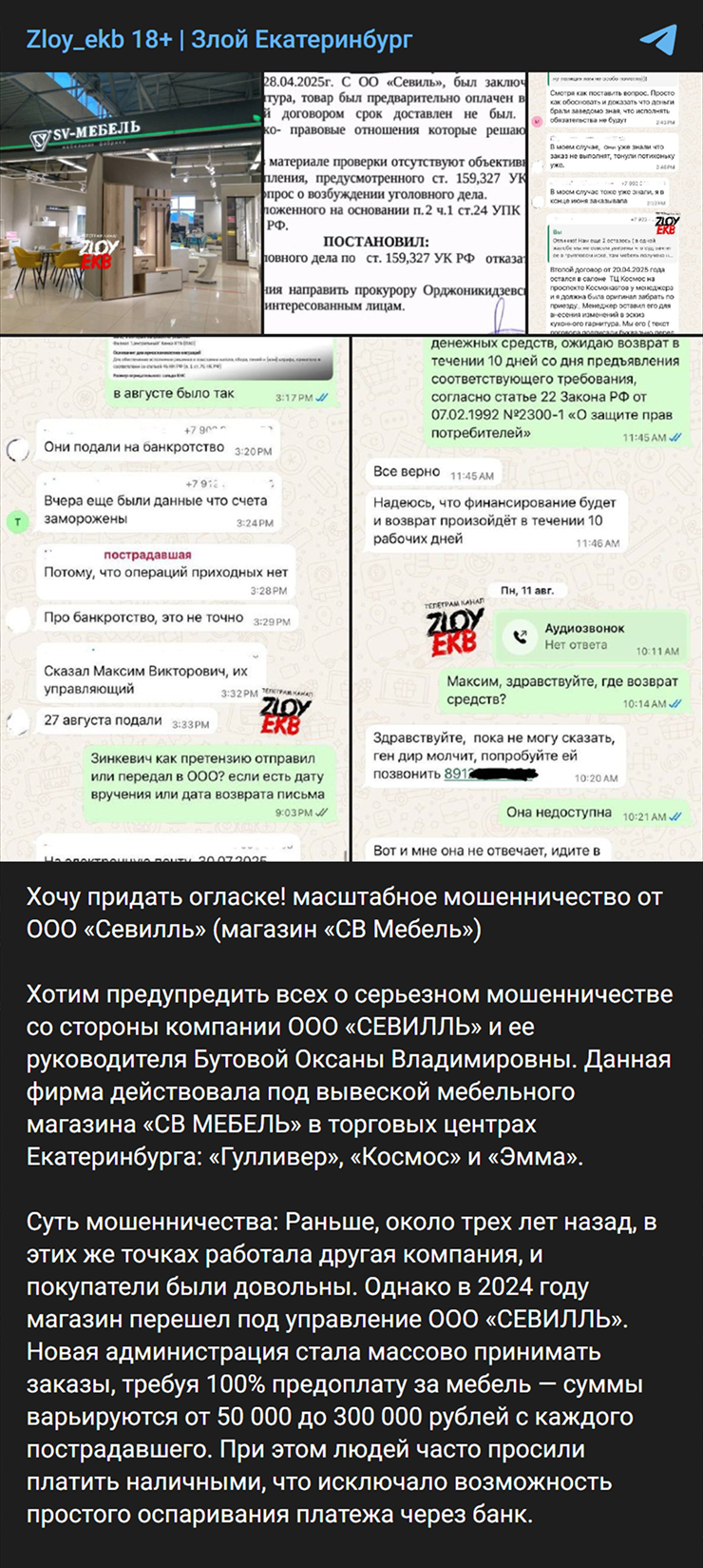 Параллельно с розыском заказа на складе мы искали варианты вернуть деньги, которые заплатили за гарнитур в магазине «SV-Мебель». Жена предположила, что от этой компании пострадали и другие люди. Мы спросили в домовом чате, не заказывал ли кто-то у них мебель. Оказалось, что из нашего дома есть еще трое покупателей, которые не получили заказ.