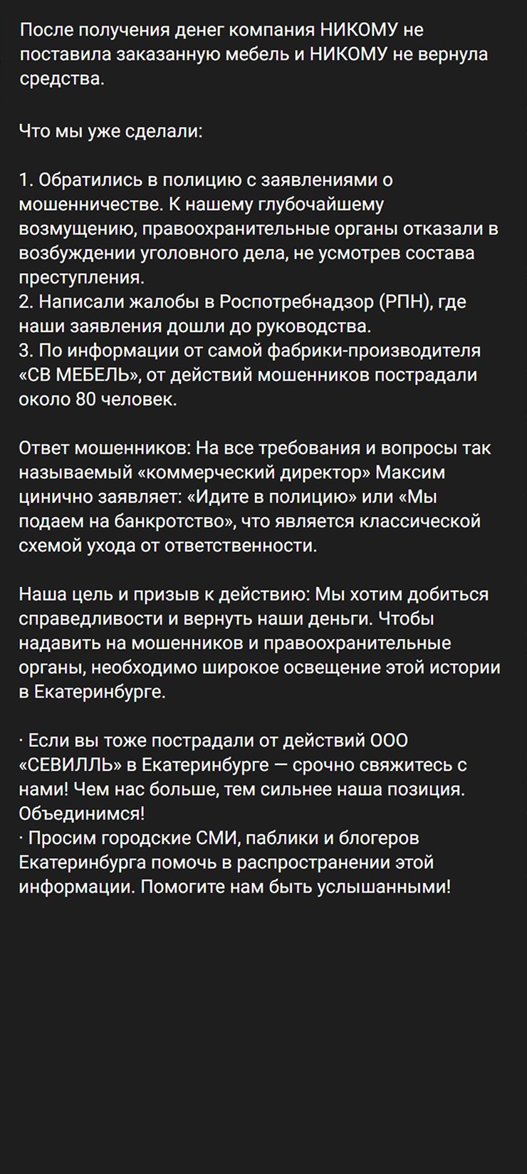 Мы предполагали, что коллективно вернуть деньги будет проще. Выяснили, что мебель не привезли 56 клиентам в Перми, а в Екатеринбурге, где у ООО «Севилль» тоже был магазин, пострадавших было больше. Кто-то уже написал заявление о мошенничестве в полицию, но его не приняли и посоветовали обратиться в суд.