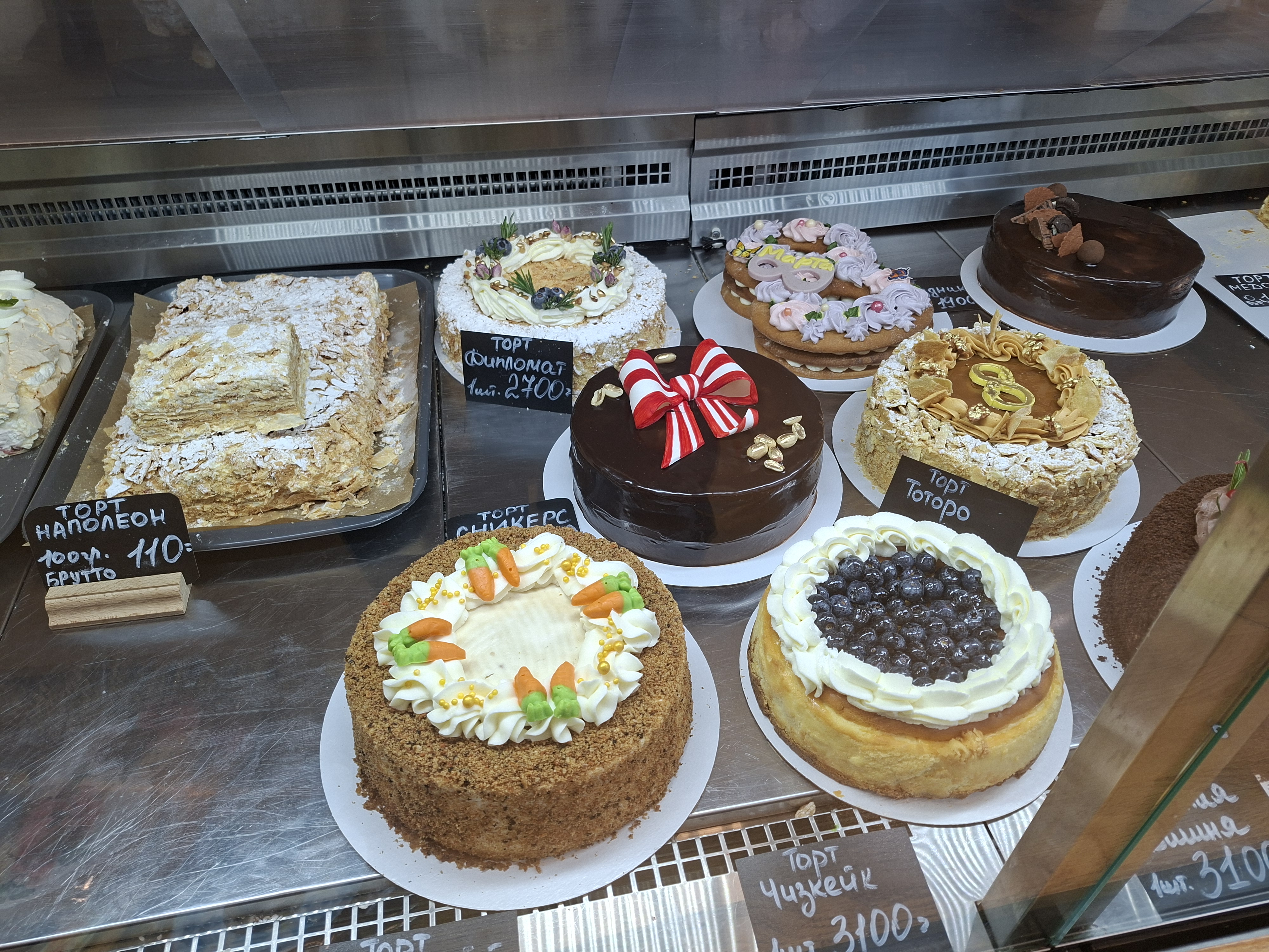 Но! В глубине магазина была пекарня. С умильно-домашними тортиками, которые пеклись и по мере сил украшались прямо там же. Купили и пирожных, и тортов, и хорошей знакомой меренговый рулет в подарок… (дома попробовали "вкусняшки" и всё выкинули, не едим мы прогорклый несвежий маргарин, даже сдобренный тонной сахара).
