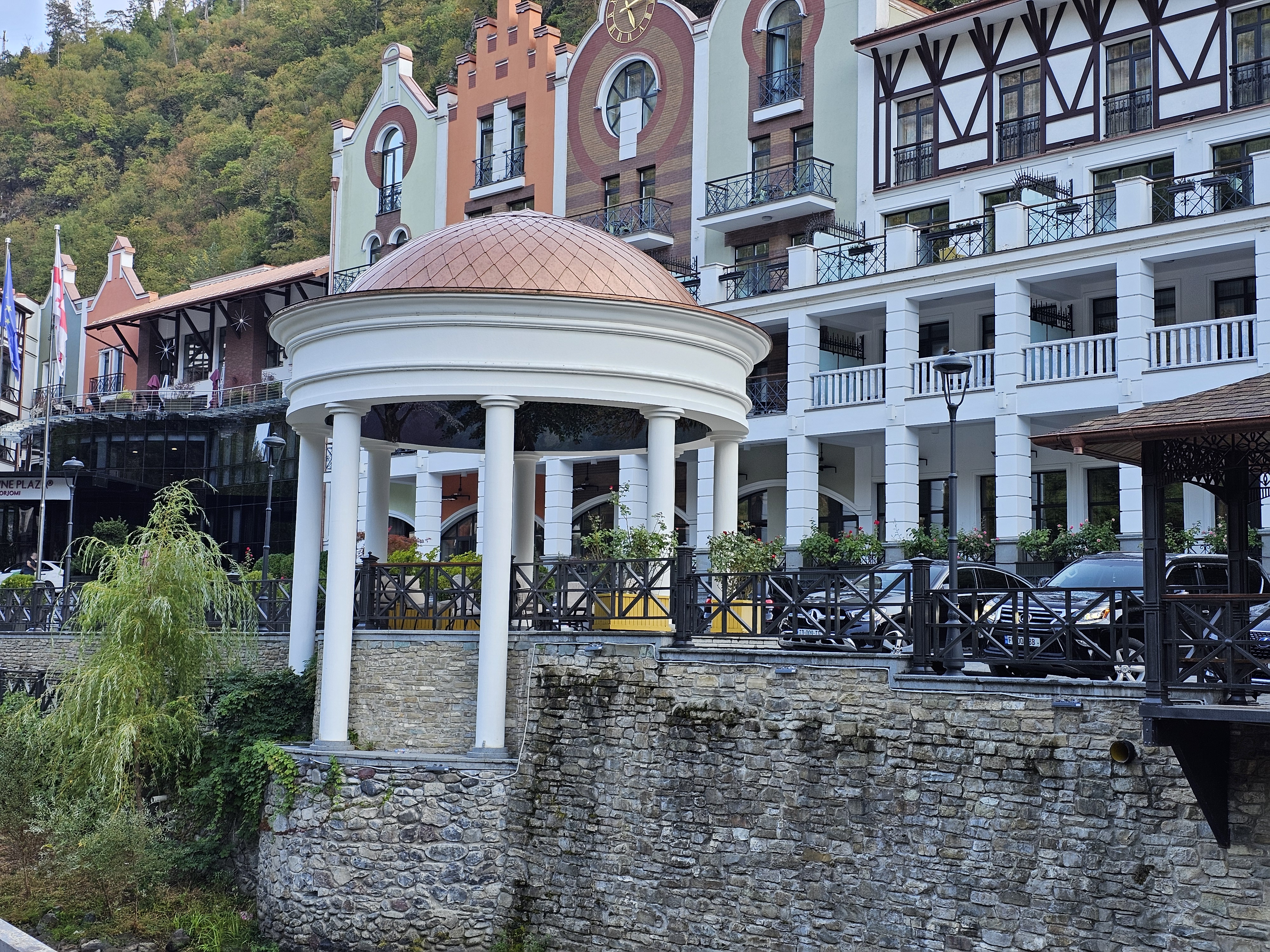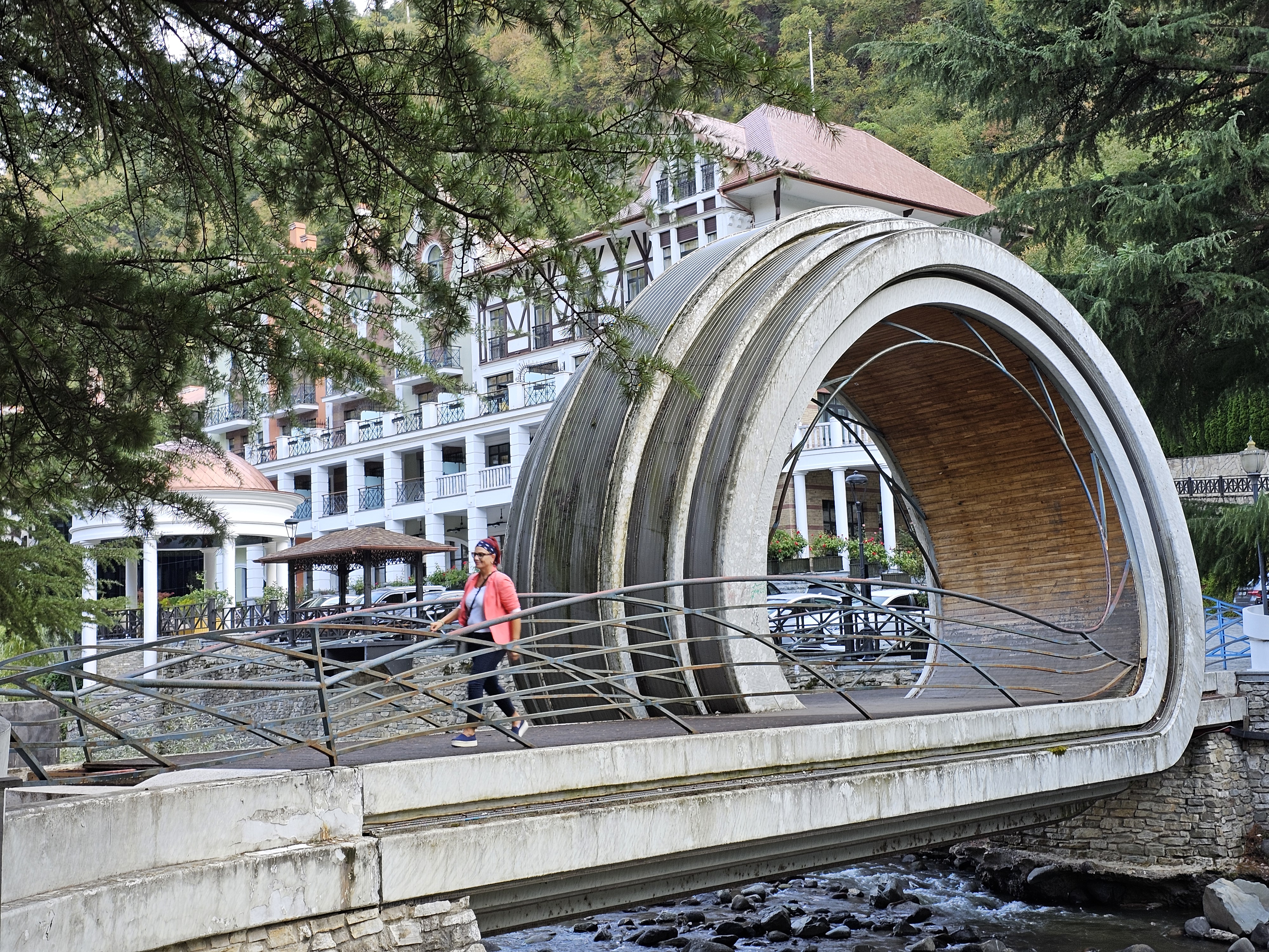 Парк Боржоми — как Кисловодск на минималках. Отдаленно напоминает Карловы Вары, но намного меньше. Течет река, вокруг нее парк, куча гостиниц и рестиков. Вдоль реки — пешеходная набережная. В конце — два источника, холодный и теплый. Самая вкусная вода — в холодном, но она сильно отличается от того, что в бутылках. Рестики все — туристические, в Тбилиси кормят намного вкуснее и цены значительно ниже. Возможно есть рестораны для местных, но мы не нашли.