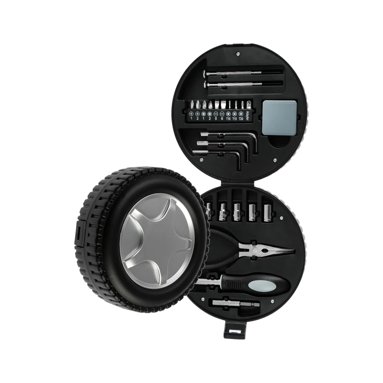 Сет для тех, к кому Дед Мороз приезжает не на санях, а на новом импортном кроссовере. Не займет много места — диаметр колеса всего 16,5 см. Внутри собраны инструменты для несложного ремонта: самые разные отвертки и биты, торцевые головки и шестигранные ключи, длинногубцы и рулетка