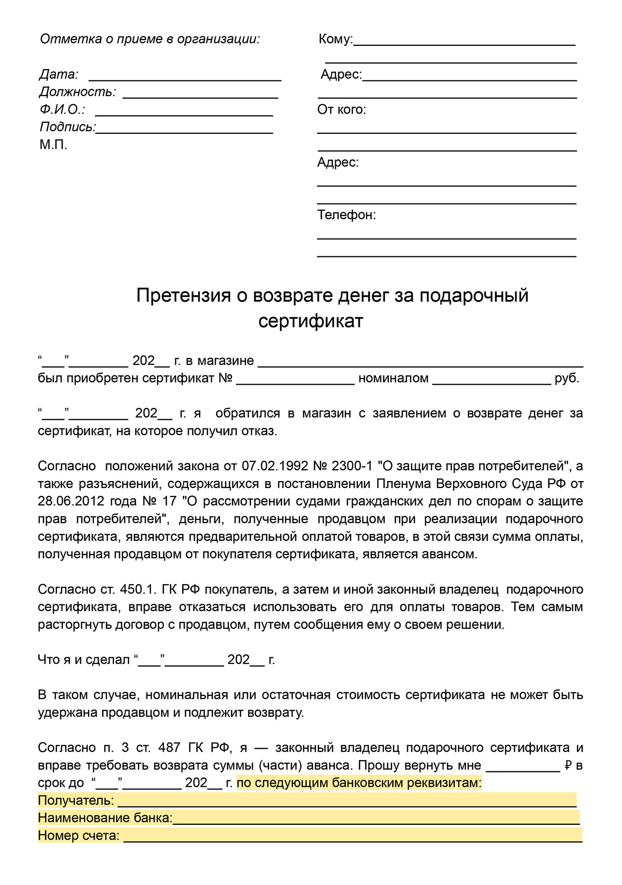 Следует начать процесс с общения с магазином: попросить его принять сертификат обратно и вернуть вам сумму номинала. Можно попробовать сделать это устно. Если вам откажут, составьте и отправьте в магазин заявление по шаблону Т—Ж. Распечатайте его в двух экземплярах: один для магазина, а второй — для себя.