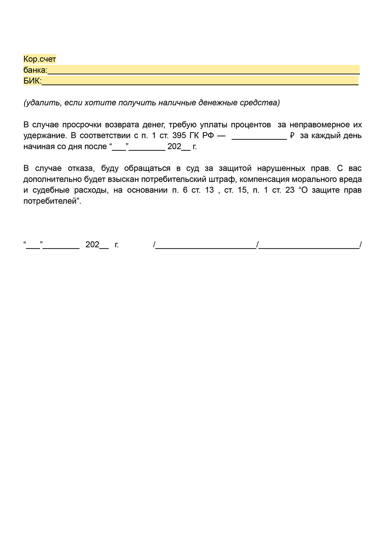 Если в течение 10 календарных дней после дня подачи заявления магазин не перечислил деньги, пишите претензию . Строгой формы претензии нет, вы можете воспользоваться шаблоном Т—Ж.