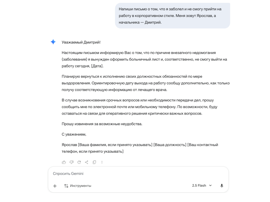 Если сравнивать с Gemini, которой я пользуюсь регулярно, нейросеть от Google — пусть и недоступная в России — справилась заметно лучше. Она быстрее выдала более развернутый и формальный ответ, к тому же учла необходимость упомянуть корпоративные данные.