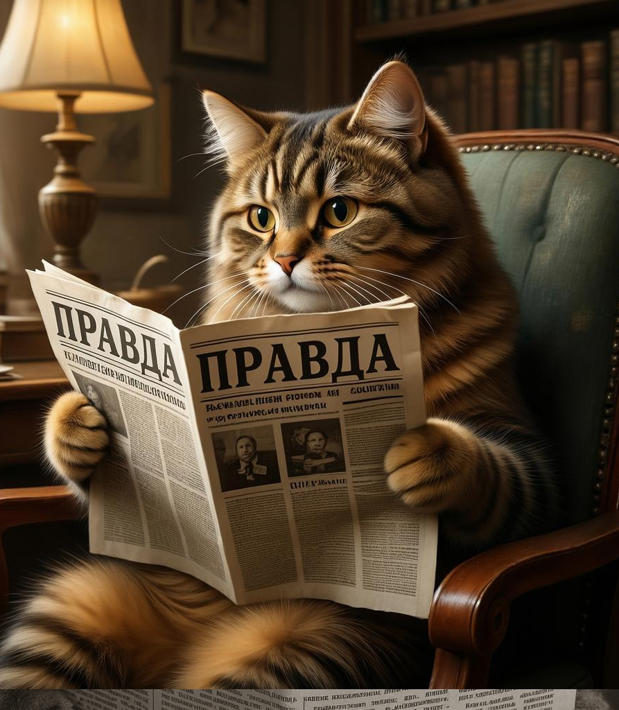 Генерировать картинки. За это отвечает нейросеть Kandinsky. Изображения можно создавать прямо в диалоге с чат-ботом. Достаточно начать запрос словами вроде «нарисуй…». Я попросил GigaChat изобразить кота, читающего газету «Правда».